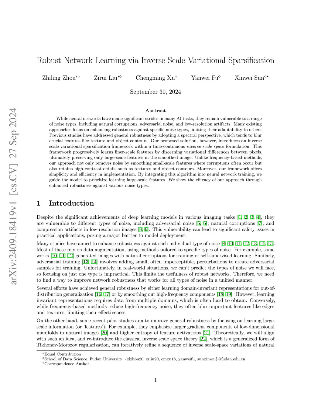 While neural networks have made significant strides in many AI tasks, they remain vulnerable to a range of noise types, including natural corruptions, adversarial noise, and low-resolution artifacts. Many existing approaches focus on enhancing robustness against specific noise types, limiting their adaptability to others. Previous studies have addressed general robustness by adopting a spectral perspective, which tends to blur crucial features like texture and object contours. Our proposed solution, however, introduces an inverse scale variational sparsification framework within a time-continuous inverse scale space formulation. This framework progressively learns finer-scale features by discerning variational differences between pixels, ultimately preserving only large-scale features in the smoothed image. Unlike frequency-based methods, our approach not only removes noise by smoothing small-scale features where corruptions often occur but also retains high-contrast details such as textures and object contours. Moreover, our framework offers simplicity and efficiency in implementation. By integrating this algorithm into neural network training, we guide the model to prioritize learning large-scale features. We show the efficacy of our approach through enhanced robustness against various noise types.