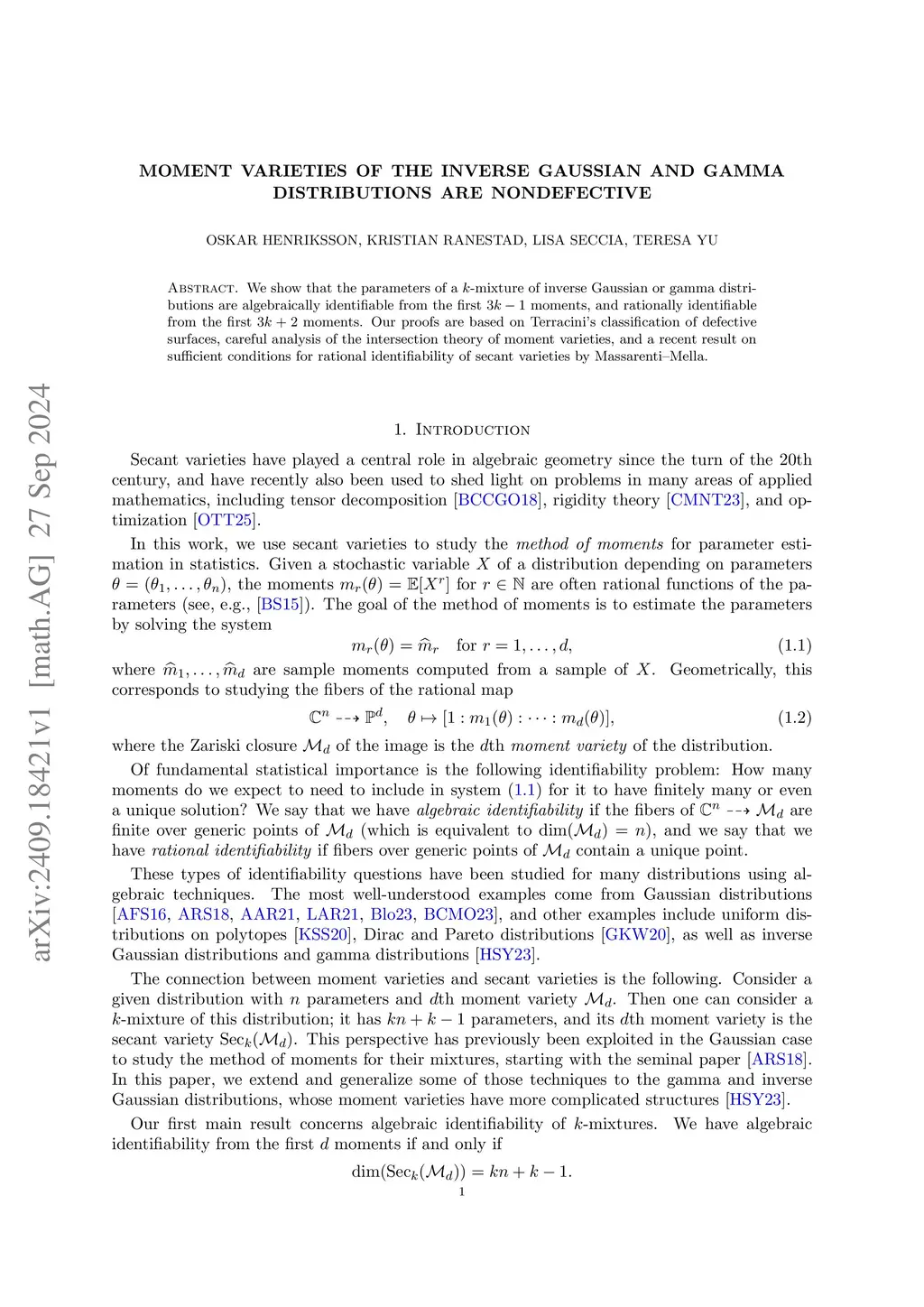 We show that the parameters of a -mixture of inverse Gaussian or gamma distributions are algebraically identifiable from the first moments, and rationally identifiable from the first moments. Our proofs are based on Terracini's classification of defective surfaces, careful analysis of the intersection theory of moment varieties, and a recent result on sufficient conditions for rational identifiability of secant varieties by Massarenti--Mella.