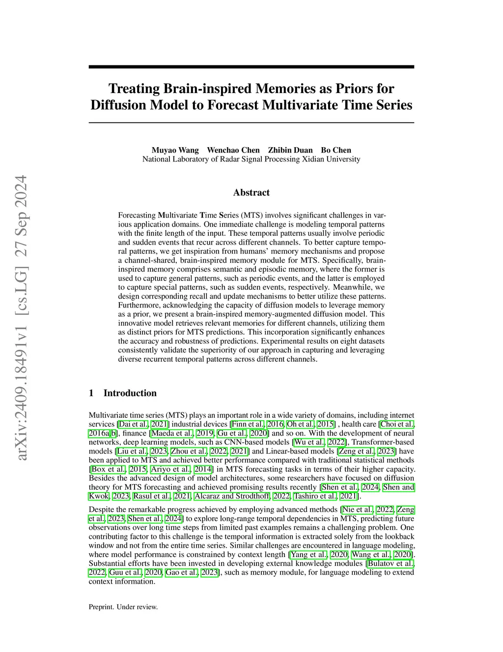 Forecasting Multivariate Time Series (MTS) involves significant challenges in various application domains. One immediate challenge is modeling temporal patterns with the finite length of the input. These temporal patterns usually involve periodic and sudden events that recur across different channels. To better capture temporal patterns, we get inspiration from humans' memory mechanisms and propose a channel-shared, brain-inspired memory module for MTS. Specifically, brain-inspired memory comprises semantic and episodic memory, where the former is used to capture general patterns, such as periodic events, and the latter is employed to capture special patterns, such as sudden events, respectively. Meanwhile, we design corresponding recall and update mechanisms to better utilize these patterns. Furthermore, acknowledging the capacity of diffusion models to leverage memory as a prior, we present a brain-inspired memory-augmented diffusion model. This innovative model retrieves relevant memories for different channels, utilizing them as distinct priors for MTS predictions. This incorporation significantly enhances the accuracy and robustness of predictions. Experimental results on eight datasets consistently validate the superiority of our approach in capturing and leveraging diverse recurrent temporal patterns across different channels.
