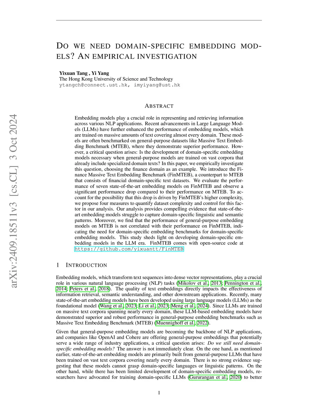 Embedding models play a crucial role in representing and retrieving information across various NLP applications. Recent advancements in Large Language Models (LLMs) have further enhanced the performance of embedding models, which are trained on massive amounts of text covering almost every domain. These models are often benchmarked on general-purpose datasets like Massive Text Embedding Benchmark (MTEB), where they demonstrate superior performance. However, a critical question arises: Is the development of domain-specific embedding models necessary when general-purpose models are trained on vast corpora that already include specialized domain texts? In this paper, we empirically investigate this question, choosing the finance domain as an example. We introduce the Finance Massive Text Embedding Benchmark (FinMTEB), a counterpart to MTEB that consists of financial domain-specific text datasets. We evaluate the performance of seven state-of-the-art embedding models on FinMTEB and observe a significant performance drop compared to their performance on MTEB. To account for the possibility that this drop is driven by FinMTEB's higher complexity, we propose four measures to quantify dataset complexity and control for this factor in our analysis. Our analysis provides compelling evidence that state-of-the-art embedding models struggle to capture domain-specific linguistic and semantic patterns. Moreover, we find that the performance of general-purpose embedding models on MTEB is not correlated with their performance on FinMTEB, indicating the need for domain-specific embedding benchmarks for domain-specific embedding models. This study sheds light on developing domain-specific embedding models in the LLM era. FinMTEB comes with open-source code atthis https URL
