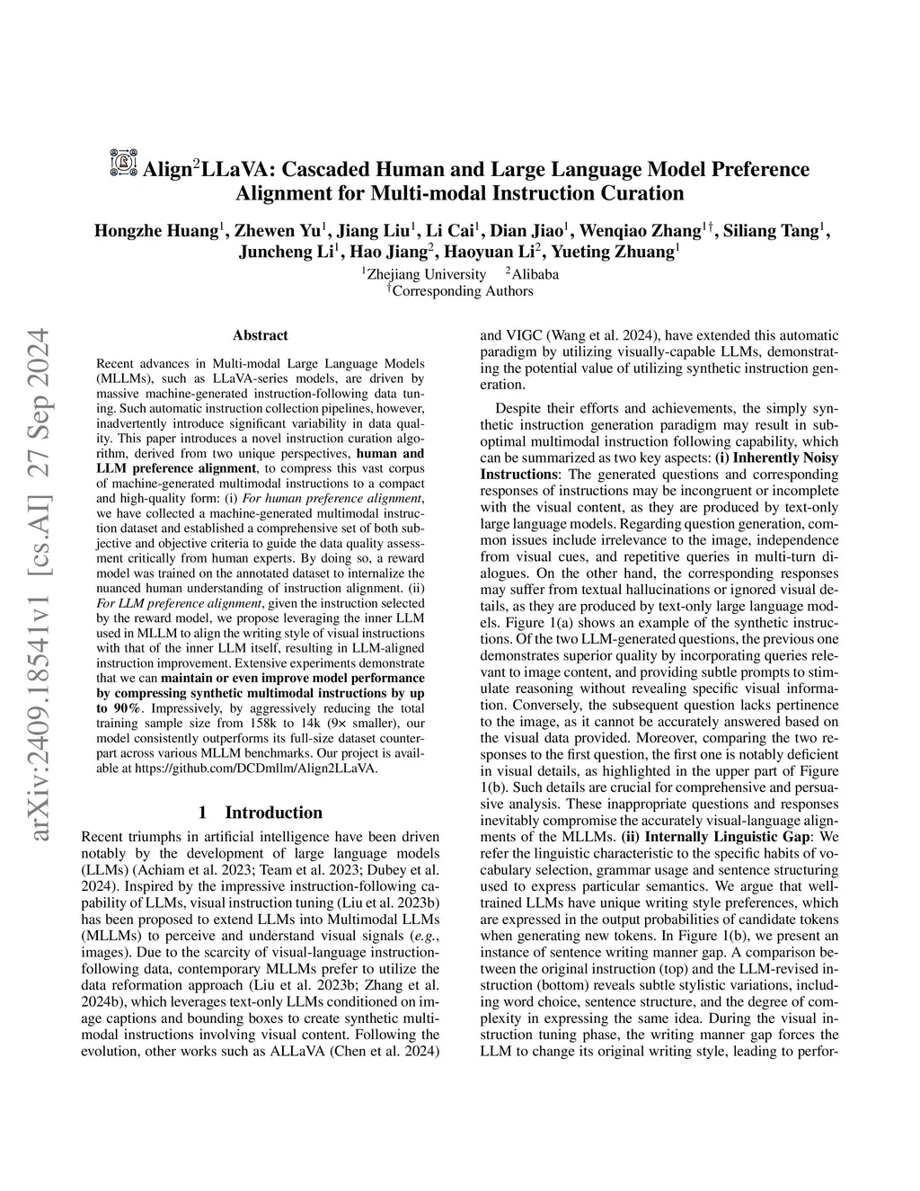 Recent advances in Multi-modal Large Language Models (MLLMs), such as LLaVA-series models, are driven by massive machine-generated instruction-following data tuning. Such automatic instruction collection pipelines, however, inadvertently introduce significant variability in data quality. This paper introduces a novel instruction curation algorithm, derived from two unique perspectives, human and LLM preference alignment, to compress this vast corpus of machine-generated multimodal instructions to a compact and high-quality form: (i) For human preference alignment, we have collected a machine-generated multimodal instruction dataset and established a comprehensive set of both subjective and objective criteria to guide the data quality assessment critically from human experts. By doing so, a reward model was trained on the annotated dataset to internalize the nuanced human understanding of instruction alignment. (ii) For LLM preference alignment, given the instruction selected by the reward model, we propose leveraging the inner LLM used in MLLM to align the writing style of visual instructions with that of the inner LLM itself, resulting in LLM-aligned instruction improvement. Extensive experiments demonstrate that we can maintain or even improve model performance by compressing synthetic multimodal instructions by up to 90%. Impressively, by aggressively reducing the total training sample size from 158k to 14k (9 smaller), our model consistently outperforms its full-size dataset counterpart across various MLLM benchmarks. Our project is available at https://github.com/DCDmllm/Align2LLaVA.