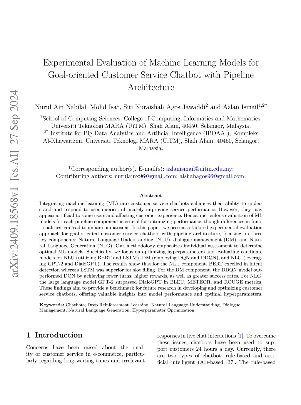 Integrating machine learning (ML) into customer service chatbots enhances their ability to understand and respond to user queries, ultimately improving service performance. However, they may appear artificial to some users and affecting customer experience. Hence, meticulous evaluation of ML models for each pipeline component is crucial for optimizing performance, though differences in functionalities can lead to unfair comparisons. In this paper, we present a tailored experimental evaluation approach for goal-oriented customer service chatbots with pipeline architecture, focusing on three key components: Natural Language Understanding (NLU), dialogue management (DM), and Natural Language Generation (NLG). Our methodology emphasizes individual assessment to determine optimal ML models. Specifically, we focus on optimizing hyperparameters and evaluating candidate models for NLU (utilizing BERT and LSTM), DM (employing DQN and DDQN), and NLG (leveraging GPT-2 and DialoGPT). The results show that for the NLU component, BERT excelled in intent detection whereas LSTM was superior for slot filling. For the DM component, the DDQN model outperformed DQN by achieving fewer turns, higher rewards, as well as greater success rates. For NLG, the large language model GPT-2 surpassed DialoGPT in BLEU, METEOR, and ROUGE metrics. These findings aim to provide a benchmark for future research in developing and optimizing customer service chatbots, offering valuable insights into model performance and optimal hyperparameters.