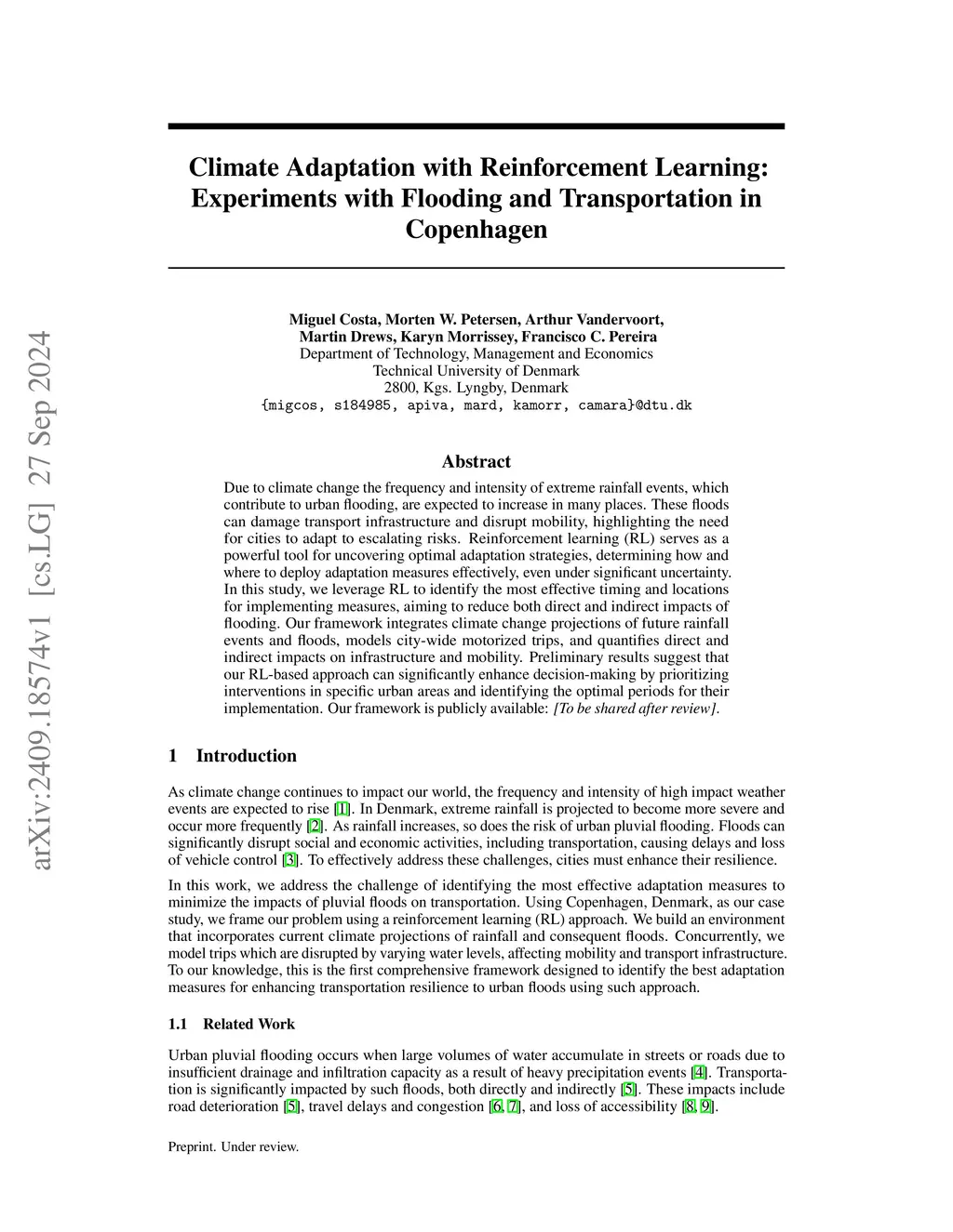 Due to climate change the frequency and intensity of extreme rainfall events, which contribute to urban flooding, are expected to increase in many places. These floods can damage transport infrastructure and disrupt mobility, highlighting the need for cities to adapt to escalating risks. Reinforcement learning (RL) serves as a powerful tool for uncovering optimal adaptation strategies, determining how and where to deploy adaptation measures effectively, even under significant uncertainty. In this study, we leverage RL to identify the most effective timing and locations for implementing measures, aiming to reduce both direct and indirect impacts of flooding. Our framework integrates climate change projections of future rainfall events and floods, models city-wide motorized trips, and quantifies direct and indirect impacts on infrastructure and mobility. Preliminary results suggest that our RL-based approach can significantly enhance decision-making by prioritizing interventions in specific urban areas and identifying the optimal periods for their implementation.
