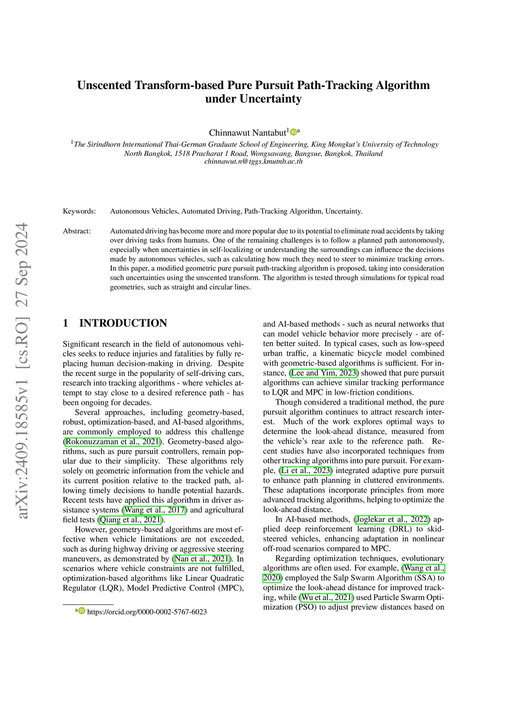 Unscented Transform-based Pure Pursuit Path-Tracking Algorithm under