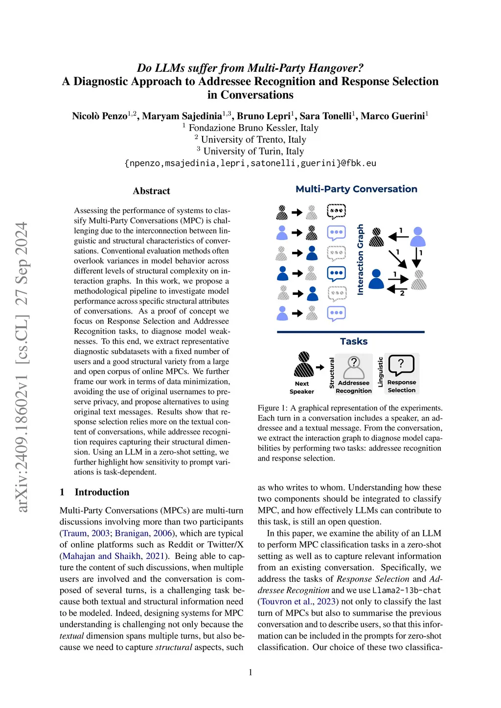 Assessing the performance of systems to classify Multi-Party Conversations (MPC) is challenging due to the interconnection between linguistic and structural characteristics of conversations. Conventional evaluation methods often overlook variances in model behavior across different levels of structural complexity on interaction graphs. In this work, we propose a methodological pipeline to investigate model performance across specific structural attributes of conversations. As a proof of concept we focus on Response Selection and Addressee Recognition tasks, to diagnose model weaknesses. To this end, we extract representative diagnostic subdatasets with a fixed number of users and a good structural variety from a large and open corpus of online MPCs. We further frame our work in terms of data minimization, avoiding the use of original usernames to preserve privacy, and propose alternatives to using original text messages. Results show that response selection relies more on the textual content of conversations, while addressee recognition requires capturing their structural dimension. Using an LLM in a zero-shot setting, we further highlight how sensitivity to prompt variations is task-dependent.