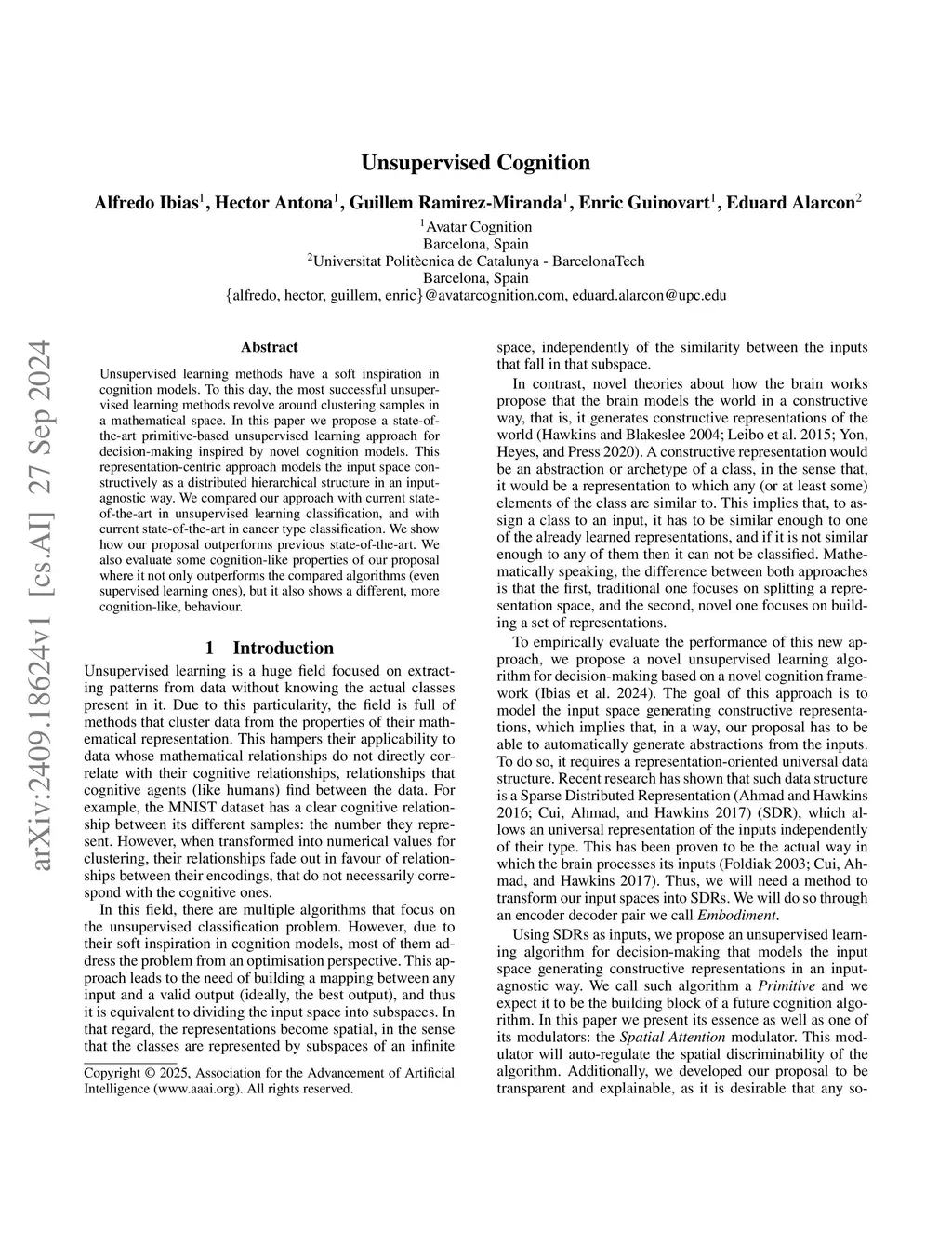 Unsupervised learning methods have a soft inspiration in cognition models. To this day, the most successful unsupervised learning methods revolve around clustering samples in a mathematical space. In this paper we propose a state-of-the-art, primitive-based, unsupervised learning approach for decision-making inspired by a novel cognition framework. This representation-centric approach models the input space constructively as a distributed hierarchical structure in an input-agnostic way. We compared our approach with both current state-of-the-art unsupervised learning classification, and with current state-of-the-art cancer type classification. We show how our proposal outperforms previous state-of-the-art. We also evaluate some cognition-like properties of our proposal where it not only outperforms the compared algorithms (even supervised learning ones), but it also shows a different, more cognition-like, behaviour.