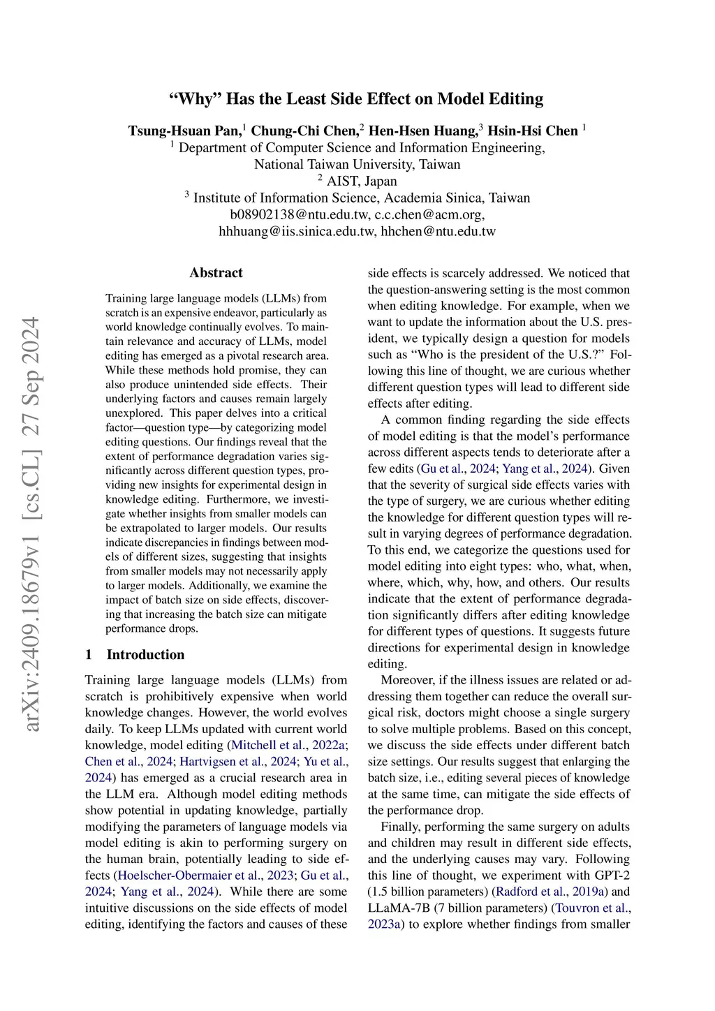 Training large language models (LLMs) from scratch is an expensive endeavor, particularly as world knowledge continually evolves. To maintain relevance and accuracy of LLMs, model editing has emerged as a pivotal research area. While these methods hold promise, they can also produce unintended side effects. Their underlying factors and causes remain largely unexplored. This paper delves into a critical factor-question type-by categorizing model editing questions. Our findings reveal that the extent of performance degradation varies significantly across different question types, providing new insights for experimental design in knowledge editing. Furthermore, we investigate whether insights from smaller models can be extrapolated to larger models. Our results indicate discrepancies in findings between models of different sizes, suggesting that insights from smaller models may not necessarily apply to larger models. Additionally, we examine the impact of batch size on side effects, discovering that increasing the batch size can mitigate performance drops.
