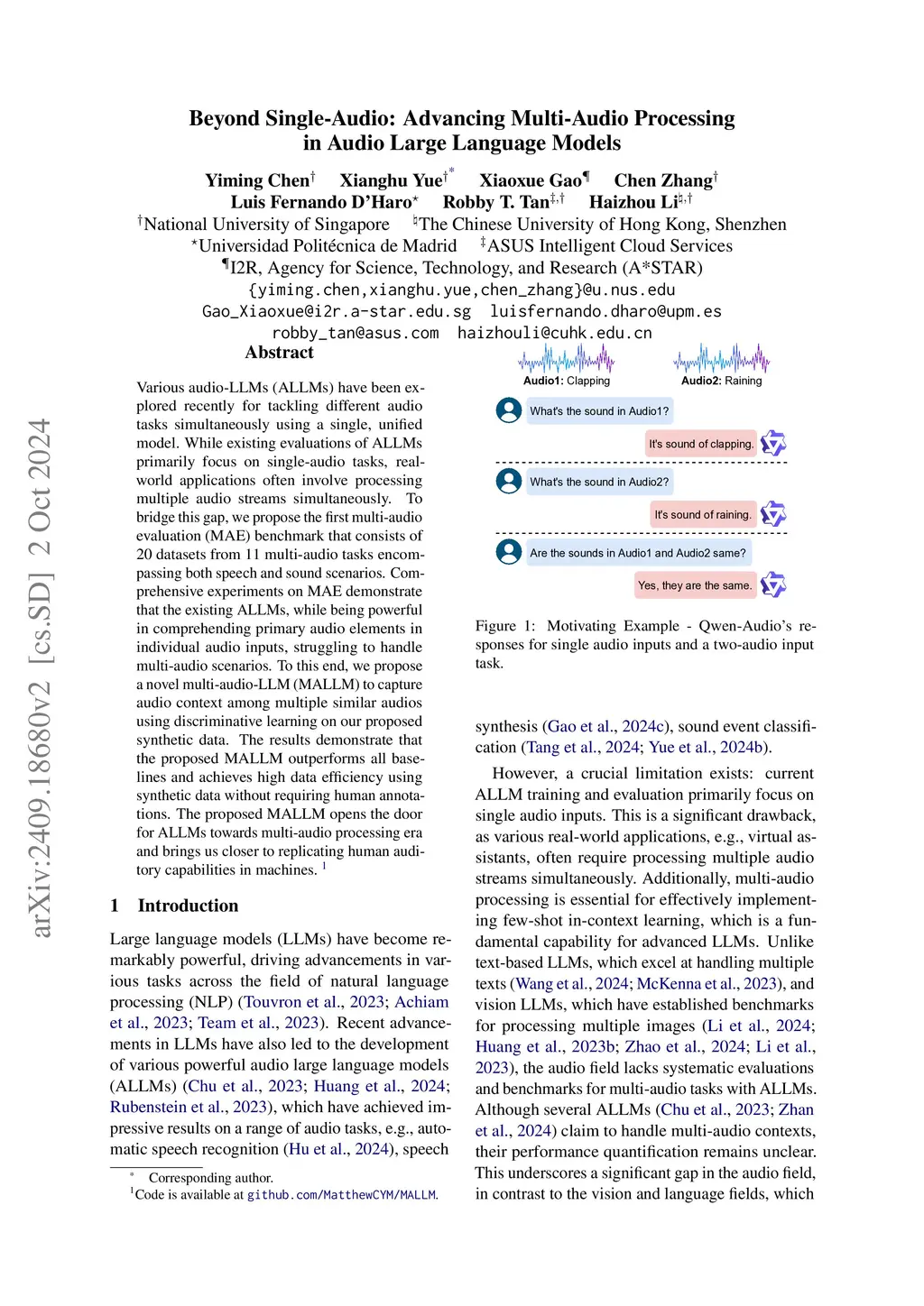Various audio-LLMs (ALLMs) have been explored recently for tackling different audio tasks simultaneously using a single, unified model. While existing evaluations of ALLMs primarily focus on single-audio tasks, real-world applications often involve processing multiple audio streams simultaneously. To bridge this gap, we propose the first multi-audio evaluation (MAE) benchmark that consists of 20 datasets from 11 multi-audio tasks encompassing both speech and sound scenarios. Comprehensive experiments on MAE demonstrate that the existing ALLMs, while being powerful in comprehending primary audio elements in individual audio inputs, struggling to handle multi-audio scenarios. To this end, we propose a novel multi-audio-LLM (MALLM) to capture audio context among multiple similar audios using discriminative learning on our proposed synthetic data. The results demonstrate that the proposed MALLM outperforms all baselines and achieves high data efficiency using synthetic data without requiring human annotations. The proposed MALLM opens the door for ALLMs towards multi-audio processing era and brings us closer to replicating human auditory capabilities in machines.