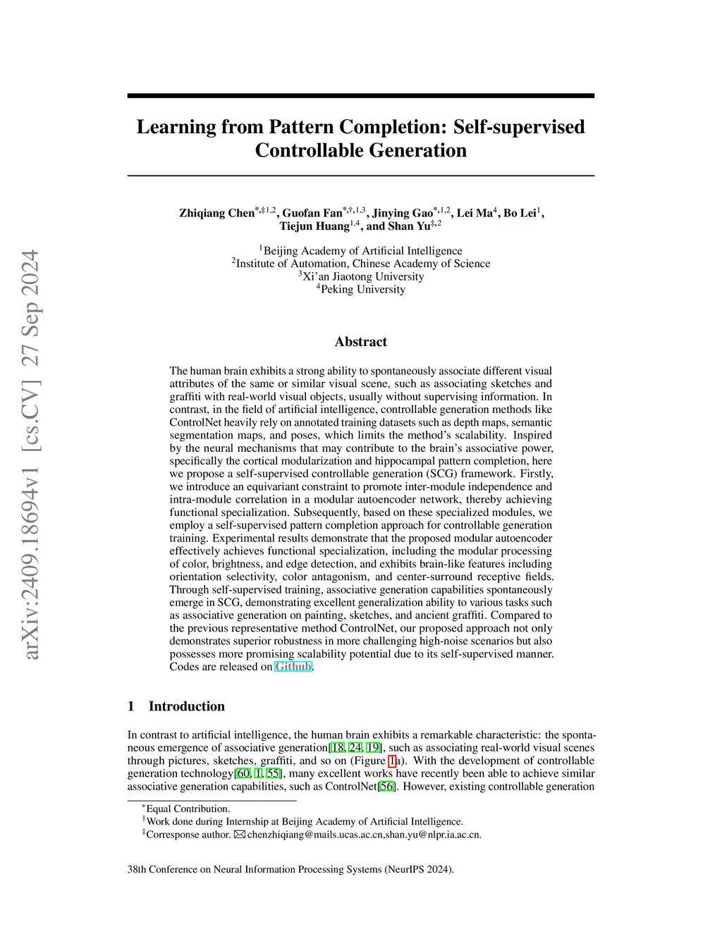 The human brain exhibits a strong ability to spontaneously associate different visual attributes of the same or similar visual scene, such as associating sketches and graffiti with real-world visual objects, usually without supervising information. In contrast, in the field of artificial intelligence, controllable generation methods like ControlNet heavily rely on annotated training datasets such as depth maps, semantic segmentation maps, and poses, which limits the method's scalability. Inspired by the neural mechanisms that may contribute to the brain's associative power, specifically the cortical modularization and hippocampal pattern completion, here we propose a self-supervised controllable generation (SCG) framework. Firstly, we introduce an equivariant constraint to promote inter-module independence and intra-module correlation in a modular autoencoder network, thereby achieving functional specialization. Subsequently, based on these specialized modules, we employ a self-supervised pattern completion approach for controllable generation training. Experimental results demonstrate that the proposed modular autoencoder effectively achieves functional specialization, including the modular processing of color, brightness, and edge detection, and exhibits brain-like features including orientation selectivity, color antagonism, and center-surround receptive fields. Through self-supervised training, associative generation capabilities spontaneously emerge in SCG, demonstrating excellent generalization ability to various tasks such as associative generation on painting, sketches, and ancient graffiti. Compared to the previous representative method ControlNet, our proposed approach not only demonstrates superior robustness in more challenging high-noise scenarios but also possesses more promising scalability potential due to its self-supervised manner.