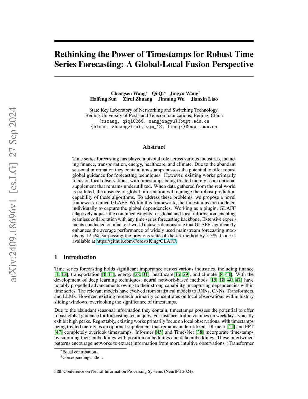 Time series forecasting has played a pivotal role across various industries, including finance, transportation, energy, healthcare, and climate. Due to the abundant seasonal information they contain, timestamps possess the potential to offer robust global guidance for forecasting techniques. However, existing works primarily focus on local observations, with timestamps being treated merely as an optional supplement that remains underutilized. When data gathered from the real world is polluted, the absence of global information will damage the robust prediction capability of these algorithms. To address these problems, we propose a novel framework named GLAFF. Within this framework, the timestamps are modeled individually to capture the global dependencies. Working as a plugin, GLAFF adaptively adjusts the combined weights for global and local information, enabling seamless collaboration with any time series forecasting backbone. Extensive experiments conducted on nine real-world datasets demonstrate that GLAFF significantly enhances the average performance of widely used mainstream forecasting models by 12.5%, surpassing the previous state-of-the-art method by 5.5%.
