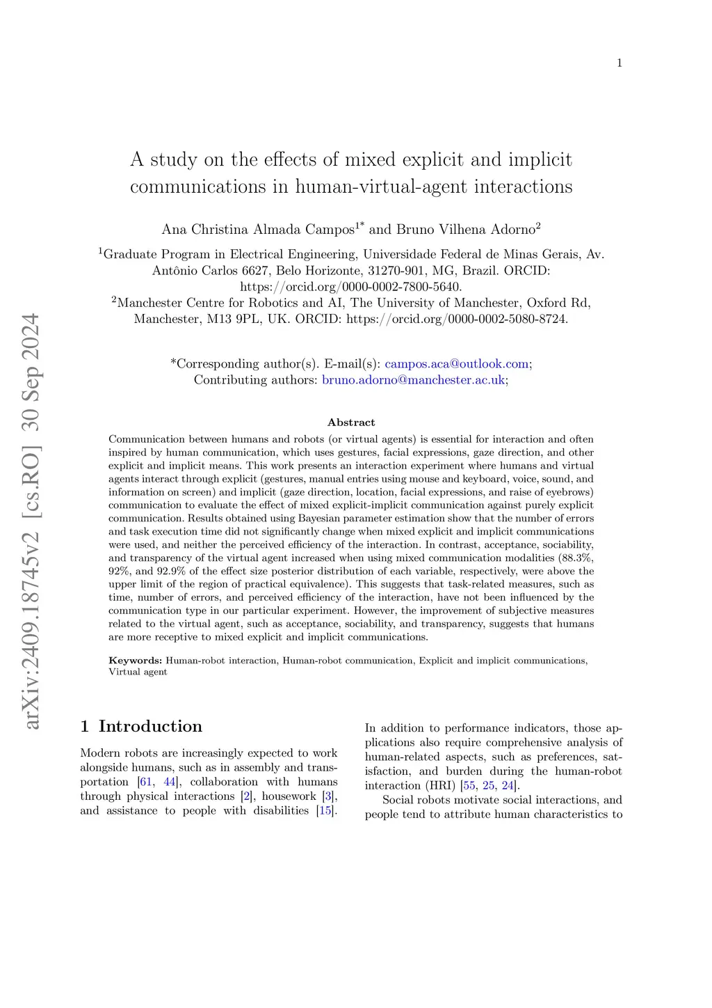 A study on the effects of mixed explicit and implicit communications in human-virtual-agent interactions