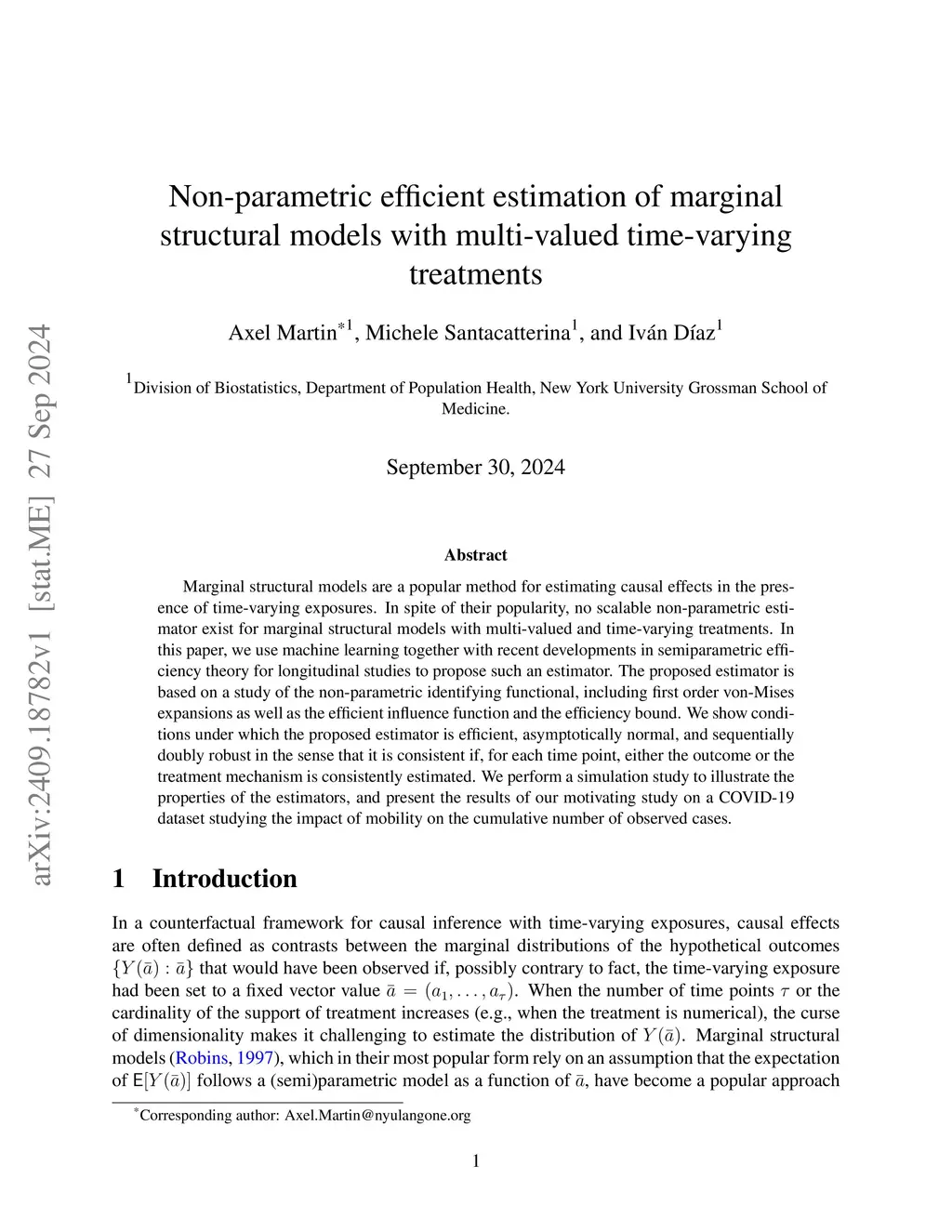 Marginal structural models are a popular method for estimating causal effects in the presence of time-varying exposures. In spite of their popularity, no scalable non-parametric estimator exist for marginal structural models with multi-valued and time-varying treatments. In this paper, we use machine learning together with recent developments in semiparametric efficiency theory for longitudinal studies to propose such an estimator. The proposed estimator is based on a study of the non-parametric identifying functional, including first order von-Mises expansions as well as the efficient influence function and the efficiency bound. We show conditions under which the proposed estimator is efficient, asymptotically normal, and sequentially doubly robust in the sense that it is consistent if, for each time point, either the outcome or the treatment mechanism is consistently estimated. We perform a simulation study to illustrate the properties of the estimators, and present the results of our motivating study on a COVID-19 dataset studying the impact of mobility on the cumulative number of observed cases.