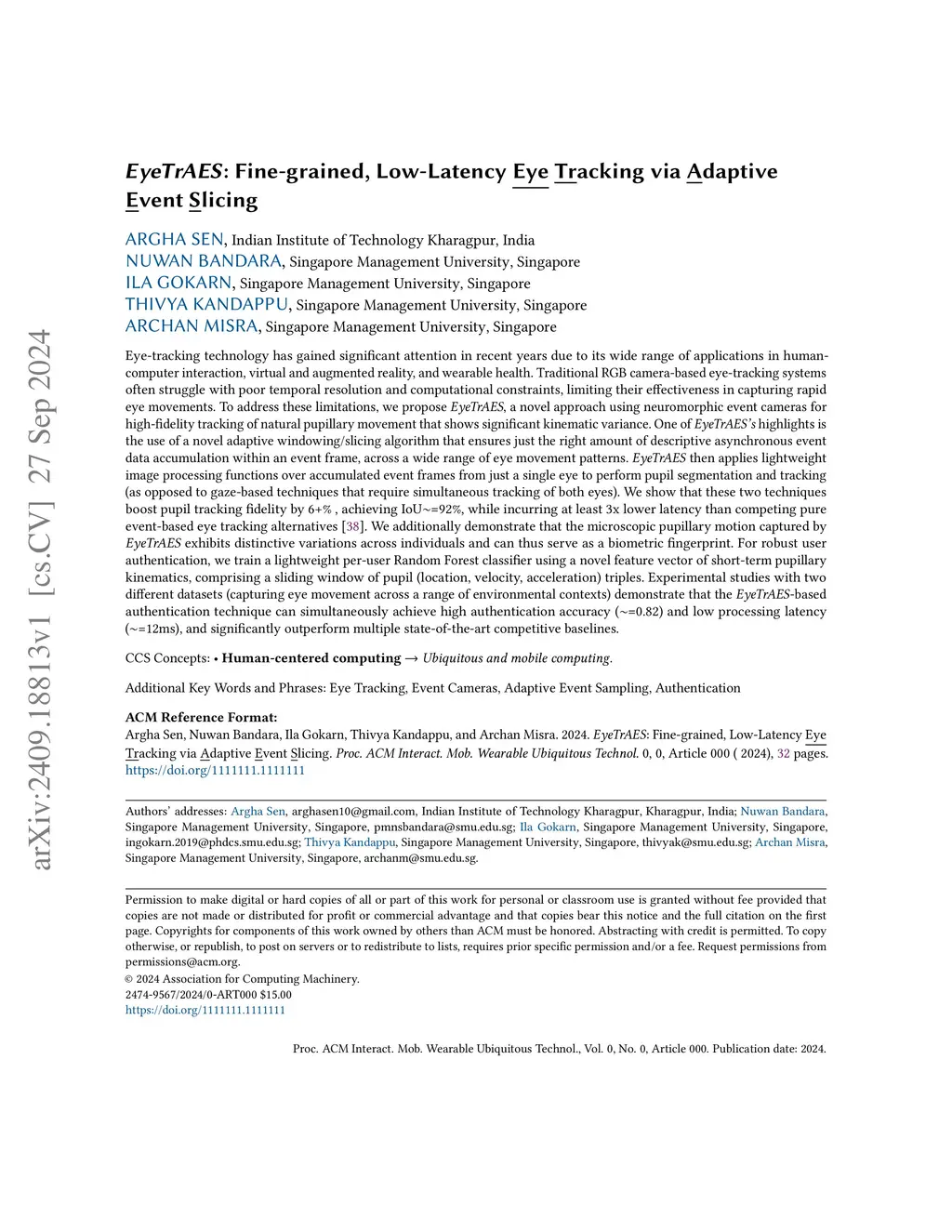 Eye-tracking technology has gained significant attention in recent years due to its wide range of applications in human-computer interaction, virtual and augmented reality, and wearable health. Traditional RGB camera-based eye-tracking systems often struggle with poor temporal resolution and computational constraints, limiting their effectiveness in capturing rapid eye movements. To address these limitations, we propose EyeTrAES, a novel approach using neuromorphic event cameras for high-fidelity tracking of natural pupillary movement that shows significant kinematic variance. One of EyeTrAES's highlights is the use of a novel adaptive windowing/slicing algorithm that ensures just the right amount of descriptive asynchronous event data accumulation within an event frame, across a wide range of eye movement patterns. EyeTrAES then applies lightweight image processing functions over accumulated event frames from just a single eye to perform pupil segmentation and tracking. We show that these methods boost pupil tracking fidelity by 6+%, achieving IoU~=92%, while incurring at least 3x lower latency than competing pure event-based eye tracking alternatives [38]. We additionally demonstrate that the microscopic pupillary motion captured by EyeTrAES exhibits distinctive variations across individuals and can thus serve as a biometric fingerprint. For robust user authentication, we train a lightweight per-user Random Forest classifier using a novel feature vector of short-term pupillary kinematics, comprising a sliding window of pupil (location, velocity, acceleration) triples. Experimental studies with two different datasets demonstrate that the EyeTrAES-based authentication technique can simultaneously achieve high authentication accuracy (~=0.82) and low processing latency (~=12ms), and significantly outperform multiple state-of-the-art competitive baselines.