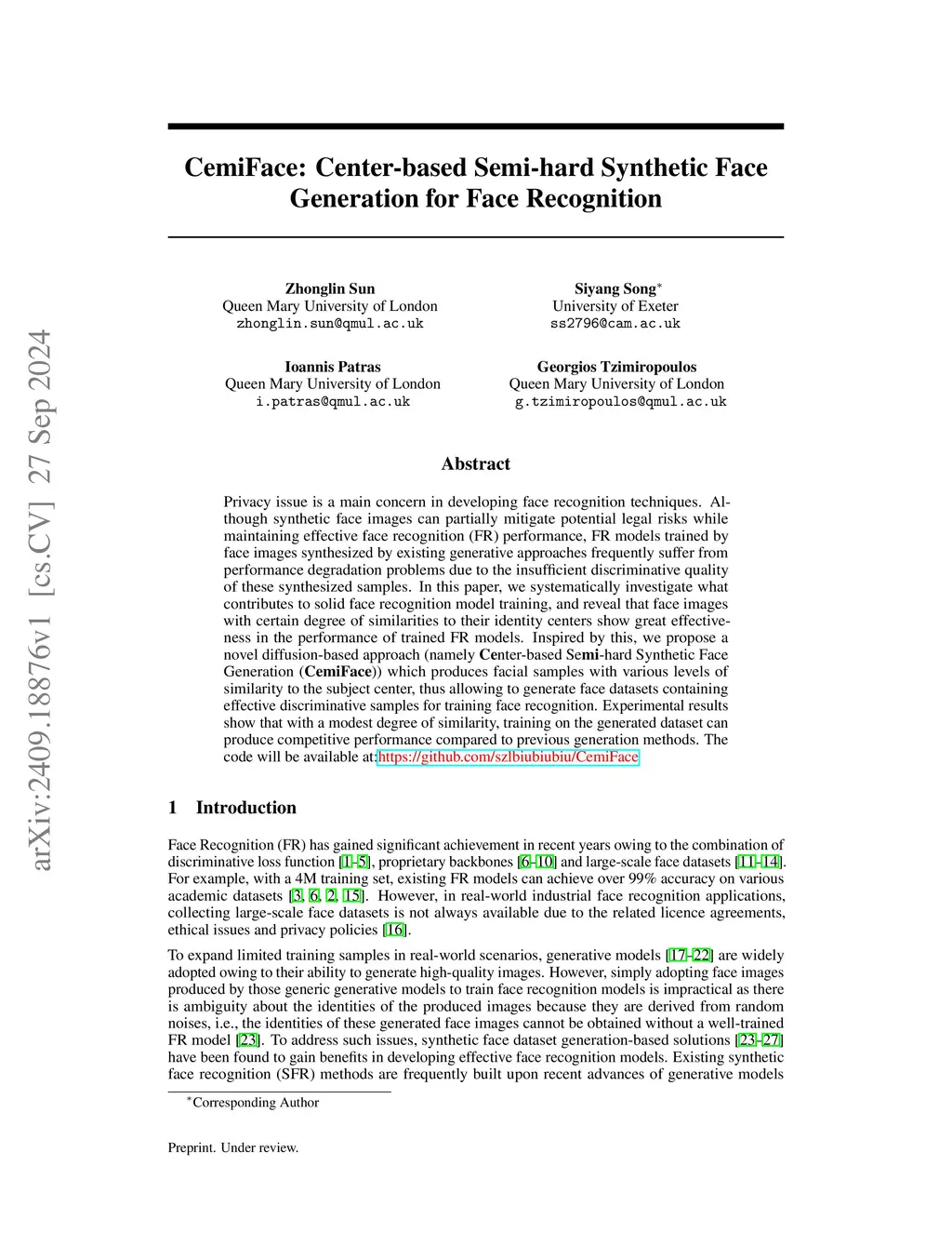 CemiFace: Center-based Semi-hard Synthetic Face Generation for Face