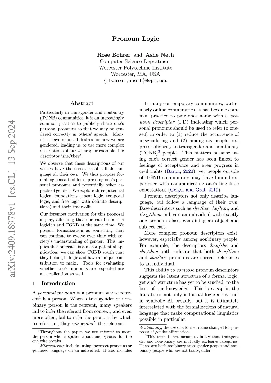 Particularly in transgender and nonbinary (TGNB) communities, it is an increasingly common practice to publicly share one's personal pronouns so that we may be gendered correctly in others' speech. Many of us have nuanced desires for how we are gendered, leading us to use more complex descriptions of our wishes; for example, the descriptor 'she/they'. We observe that these descriptions of our wishes have the structure of a little language all their own. We thus propose formal logic as a tool for expressing one's personal pronouns and potentially other aspects of gender. We explore three potential logical foundations (linear logic, temporal logic, and free logic with definite descriptions) and their trade-offs. Our foremost motivation for this proposal is play, affirming that one can be both a logician and TGNB at the same time. We present formalization as something that can continue to evolve over time with society's understanding of gender. This implies that outreach is a major potential application: we can show TGNB youth that they belong in logic and have a unique contribution to make. Tools for evaluating whether one's pronouns are respected are an application as well.