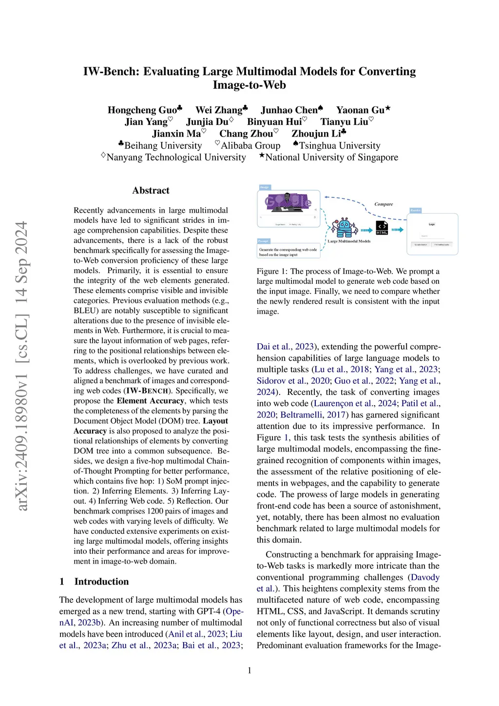 Recently advancements in large multimodal models have led to significant strides in image comprehension capabilities. Despite these advancements, there is a lack of the robust benchmark specifically for assessing the Image-to-Web conversion proficiency of these large models. Primarily, it is essential to ensure the integrity of the web elements generated. These elements comprise visible and invisible categories. Previous evaluation methods (e.g.,BLEU) are notably susceptible to significant alterations due to the presence of invisible elements in Web. Furthermore, it is crucial to measure the layout information of web pages, referring to the positional relationships between elements, which is overlooked by previous work. To address challenges, we have curated and aligned a benchmark of images and corresponding web codes (IW-BENCH). Specifically, we propose the Element Accuracy, which tests the completeness of the elements by parsing the Document Object Model (DOM) tree. Layout Accuracy is also proposed to analyze the positional relationships of elements by converting DOM tree into a common subsequence. Besides, we design a five-hop multimodal Chain-of-Thought Prompting for better performance, which contains five hop: 1) SoM prompt injection. 2) Inferring Elements. 3) Inferring Layout. 4) Inferring Web code. 5) Reflection. Our benchmark comprises 1200 pairs of images and web codes with varying levels of difficulty. We have conducted extensive experiments on existing large multimodal models, offering insights into their performance and areas for improvement in image-to-web domain.