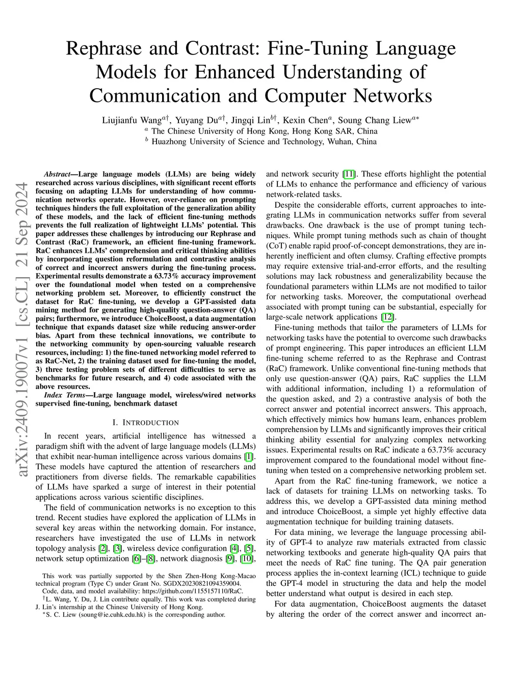 Large language models (LLMs) are being widely researched across various disciplines, with significant recent efforts focusing on adapting LLMs for understanding of how communication networks operate. However, over-reliance on prompting techniques hinders the full exploitation of the generalization ability of these models, and the lack of efficient fine-tuning methods prevents the full realization of lightweight LLMs' potential. This paper addresses these challenges by introducing our Rephrase and Contrast (RaC) framework, an efficient fine-tuning framework. RaC enhances LLMs' comprehension and critical thinking abilities by incorporating question reformulation and contrastive analysis of correct and incorrect answers during the fine-tuning process. Experimental results demonstrate a 63.73% accuracy improvement over the foundational model when tested on a comprehensive networking problem set. Moreover, to efficiently construct the dataset for RaC fine-tuning, we develop a GPT-assisted data mining method for generating high-quality question-answer (QA) pairs; furthermore, we introduce ChoiceBoost, a data augmentation technique that expands dataset size while reducing answer-order bias. Apart from these technical innovations, we contribute to the networking community by open-sourcing valuable research resources, including: 1) the fine-tuned networking model referred to as RaC-Net, 2) the training dataset used for fine-tuning the model, 3) three testing problem sets of different difficulties to serve as benchmarks for future research, and 4) code associated with the above resources.