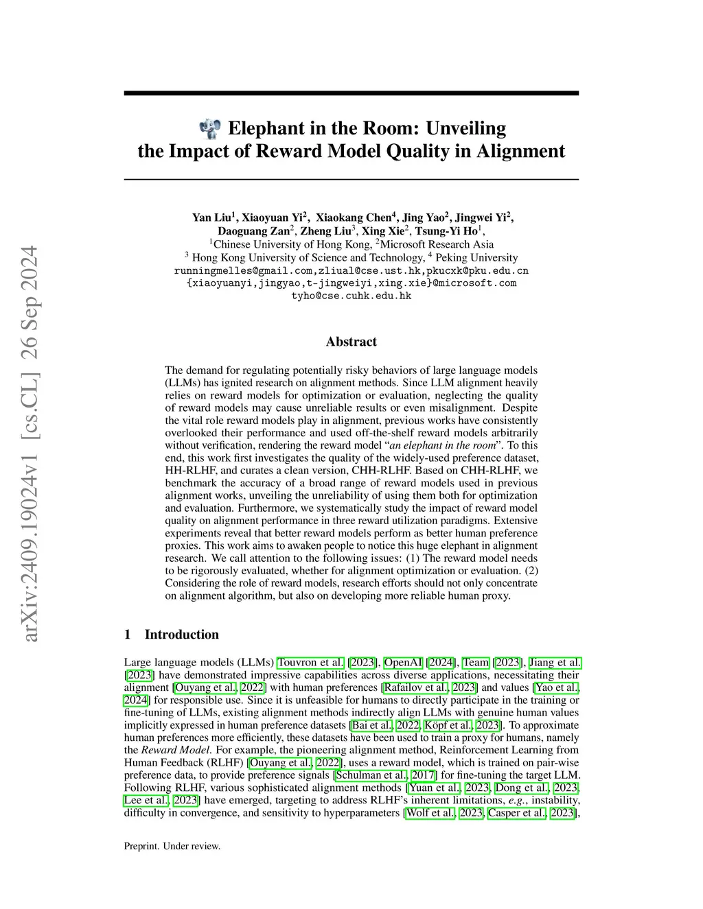 The demand for regulating potentially risky behaviors of large language models (LLMs) has ignited research on alignment methods. Since LLM alignment heavily relies on reward models for optimization or evaluation, neglecting the quality of reward models may cause unreliable results or even misalignment. Despite the vital role reward models play in alignment, previous works have consistently overlooked their performance and used off-the-shelf reward models arbitrarily without verification, rendering the reward model ``\emph{an elephant in the room}''. To this end, this work first investigates the quality of the widely-used preference dataset, HH-RLHF, and curates a clean version, CHH-RLHF. Based on CHH-RLHF, we benchmark the accuracy of a broad range of reward models used in previous alignment works, unveiling the unreliability of using them both for optimization and evaluation. Furthermore, we systematically study the impact of reward model quality on alignment performance in three reward utilization paradigms. Extensive experiments reveal that better reward models perform as better human preference proxies. This work aims to awaken people to notice this huge elephant in alignment research. We call attention to the following issues: (1) The reward model needs to be rigorously evaluated, whether for alignment optimization or evaluation. (2) Considering the role of reward models, research efforts should not only concentrate on alignment algorithm, but also on developing more reliable human proxy.