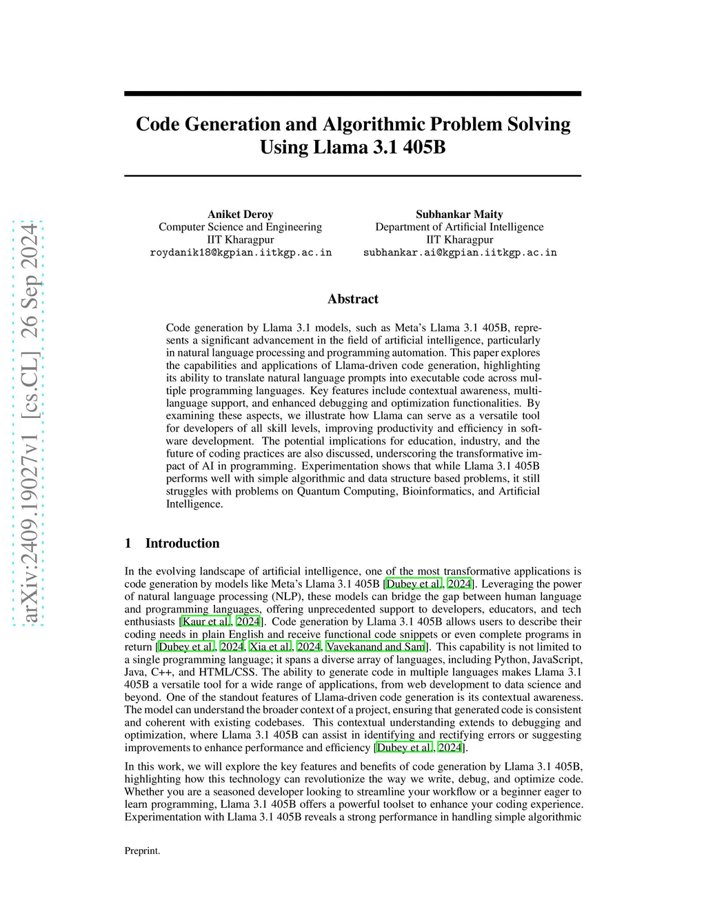 Code generation by Llama 3.1 models, such as Meta's Llama 3.1 405B, represents a significant advancement in the field of artificial intelligence, particularly in natural language processing and programming automation. This paper explores the capabilities and applications of Llama-driven code generation, highlighting its ability to translate natural language prompts into executable code across multiple programming languages. Key features include contextual awareness, multi-language support, and enhanced debugging and optimization functionalities. By examining these aspects, we illustrate how Llama can serve as a versatile tool for developers of all skill levels, improving productivity and efficiency in software development. The potential implications for education, industry, and the future of coding practices are also discussed, underscoring the transformative impact of AI in programming. Experimentation shows that while Llama 3.1 405B performs well with simple algorithmic and data structure based problems, it still struggles with problems on Quantum Computing, Bioinformatics, and Artificial Intelligence.