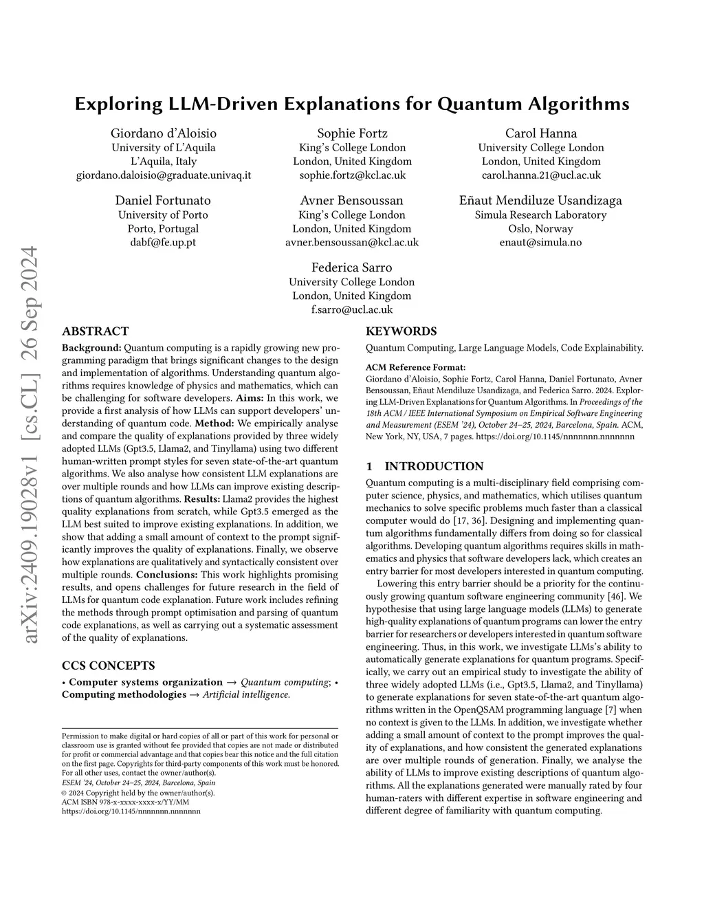 Background: Quantum computing is a rapidly growing new programming paradigm that brings significant changes to the design and implementation of algorithms. Understanding quantum algorithms requires knowledge of physics and mathematics, which can be challenging for software developers. Aims: In this work, we provide a first analysis of how LLMs can support developers' understanding of quantum code. Method: We empirically analyse and compare the quality of explanations provided by three widely adopted LLMs (Gpt3.5, Llama2, and Tinyllama) using two different human-written prompt styles for seven state-of-the-art quantum algorithms. We also analyse how consistent LLM explanations are over multiple rounds and how LLMs can improve existing descriptions of quantum algorithms. Results: Llama2 provides the highest quality explanations from scratch, while Gpt3.5 emerged as the LLM best suited to improve existing explanations. In addition, we show that adding a small amount of context to the prompt significantly improves the quality of explanations. Finally, we observe how explanations are qualitatively and syntactically consistent over multiple rounds. Conclusions: This work highlights promising results, and opens challenges for future research in the field of LLMs for quantum code explanation. Future work includes refining the methods through prompt optimisation and parsing of quantum code explanations, as well as carrying out a systematic assessment of the quality of explanations.