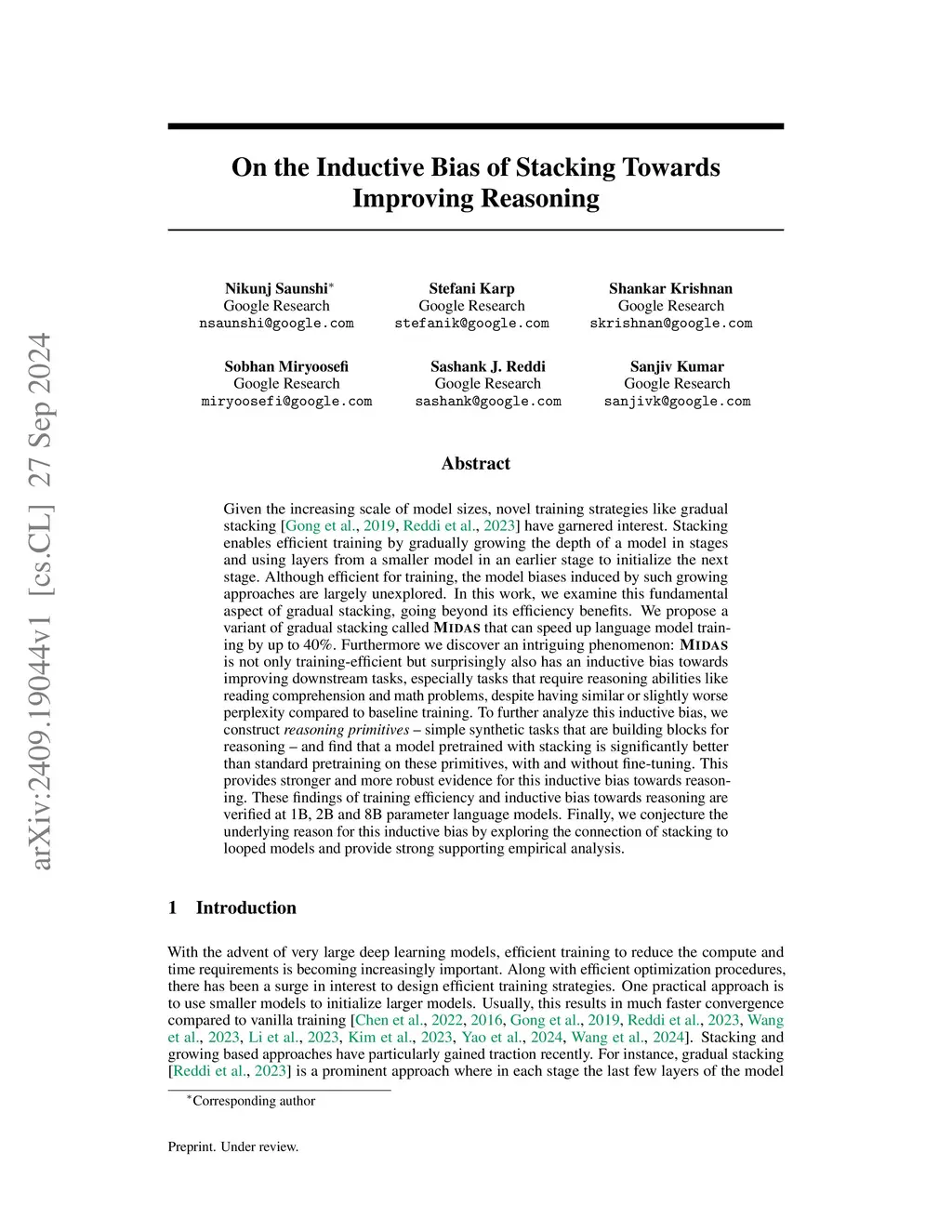 Given the increasing scale of model sizes, novel training strategies like gradual stacking [Gong et al., 2019, Reddi et al., 2023] have garnered interest. Stacking enables efficient training by gradually growing the depth of a model in stages and using layers from a smaller model in an earlier stage to initialize the next stage. Although efficient for training, the model biases induced by such growing approaches are largely unexplored. In this work, we examine this fundamental aspect of gradual stacking, going beyond its efficiency benefits. We propose a variant of gradual stacking called MIDAS that can speed up language model training by up to 40%. Furthermore we discover an intriguing phenomenon: MIDAS is not only training-efficient but surprisingly also has an inductive bias towards improving downstream tasks, especially tasks that require reasoning abilities like reading comprehension and math problems, despite having similar or slightly worse perplexity compared to baseline training. To further analyze this inductive bias, we construct reasoning primitives -- simple synthetic tasks that are building blocks for reasoning -- and find that a model pretrained with stacking is significantly better than standard pretraining on these primitives, with and without fine-tuning. This provides stronger and more robust evidence for this inductive bias towards reasoning. These findings of training efficiency and inductive bias towards reasoning are verified at 1B, 2B and 8B parameter language models. Finally, we conjecture the underlying reason for this inductive bias by exploring the connection of stacking to looped models and provide strong supporting empirical analysis.
