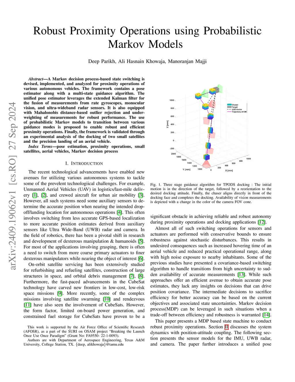 A Markov decision process-based state switching is devised, implemented, and analyzed for proximity operations of various autonomous vehicles. The framework contains a pose estimator along with a multi-state guidance algorithm. The unified pose estimator leverages the extended Kalman filter for the fusion of measurements from rate gyroscopes, monocular vision, and ultra-wideband radar sensors. It is also equipped with Mahalonobis distance-based outlier rejection and under-weighting of measurements for robust performance. The use of probabilistic Markov models to transition between various guidance modes is proposed to enable robust and efficient proximity operations. Finally, the framework is validated through an experimental analysis of the docking of two small satellites and the precision landing of an aerial vehicle.