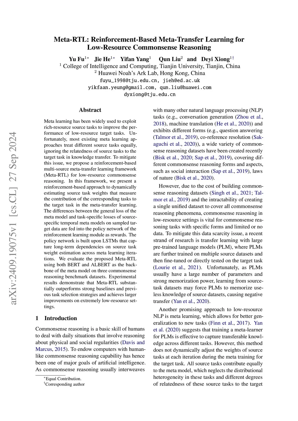 Meta-RTL: Reinforcement-Based Meta-Transfer Learning for Low-Resource Commonsense Reasoning