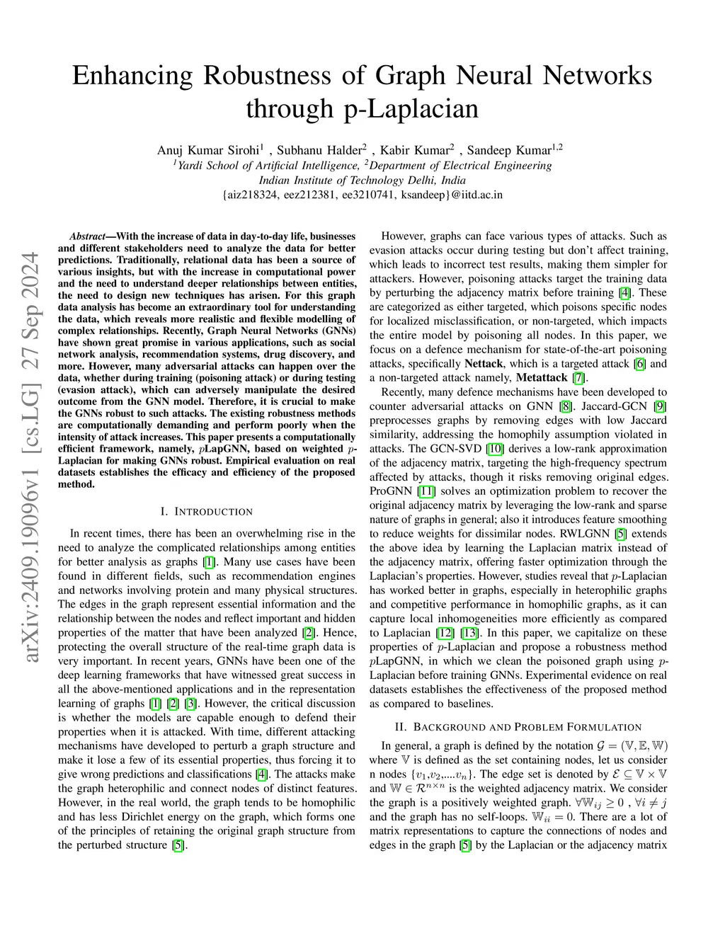 With the increase of data in day-to-day life, businesses and different stakeholders need to analyze the data for better predictions. Traditionally, relational data has been a source of various insights, but with the increase in computational power and the need to understand deeper relationships between entities, the need to design new techniques has arisen. For this graph data analysis has become an extraordinary tool for understanding the data, which reveals more realistic and flexible modelling of complex relationships. Recently, Graph Neural Networks (GNNs) have shown great promise in various applications, such as social network analysis, recommendation systems, drug discovery, and more. However, many adversarial attacks can happen over the data, whether during training (poisoning attack) or during testing (evasion attack), which can adversely manipulate the desired outcome from the GNN model. Therefore, it is crucial to make the GNNs robust to such attacks. The existing robustness methods are computationally demanding and perform poorly when the intensity of attack increases. This paper presents a computationally efficient framework, namely, pLapGNN, based on weighted p-Laplacian for making GNNs robust. Empirical evaluation on real datasets establishes the efficacy and efficiency of the proposed method.