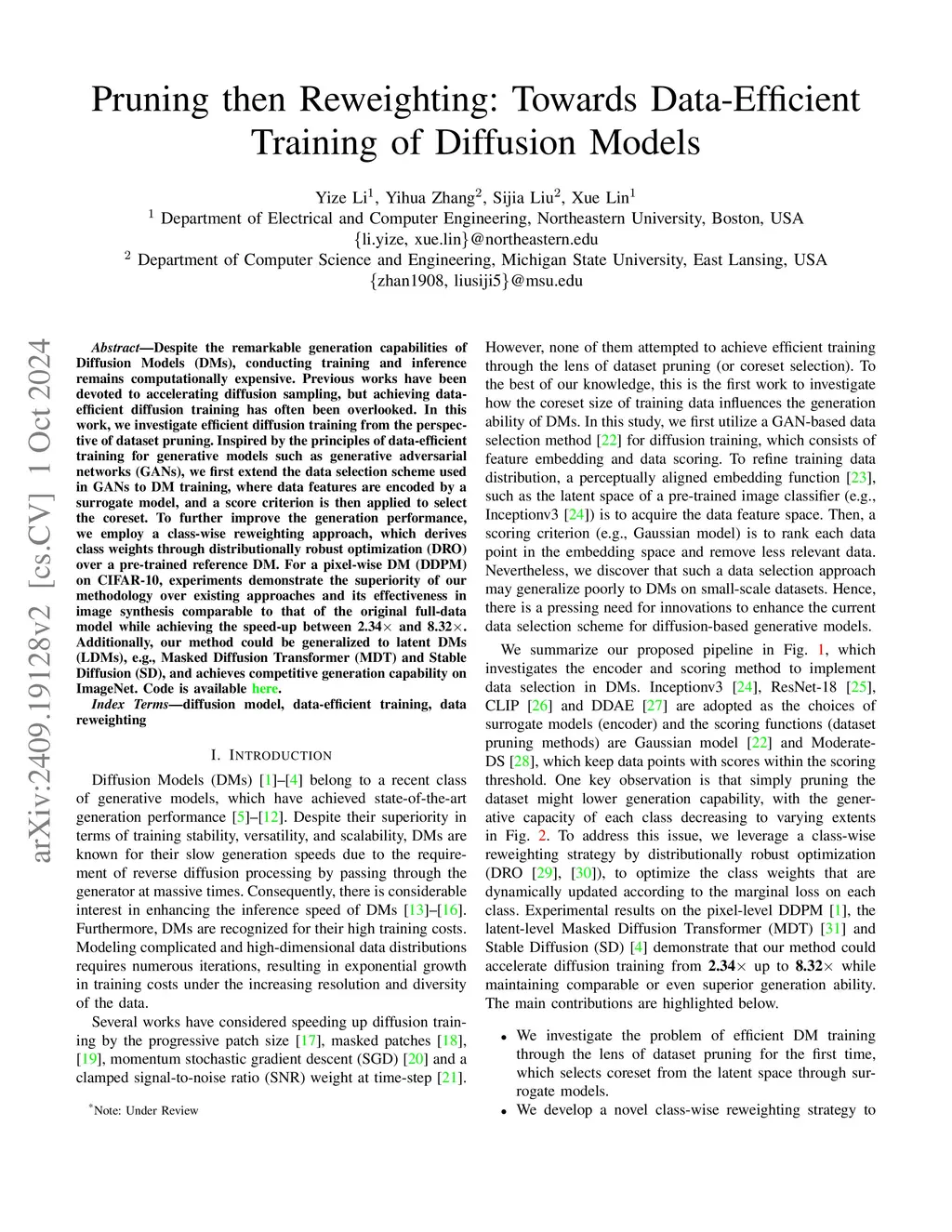 Pruning then Reweighting: Towards Data-Efficient Training of Diffusion