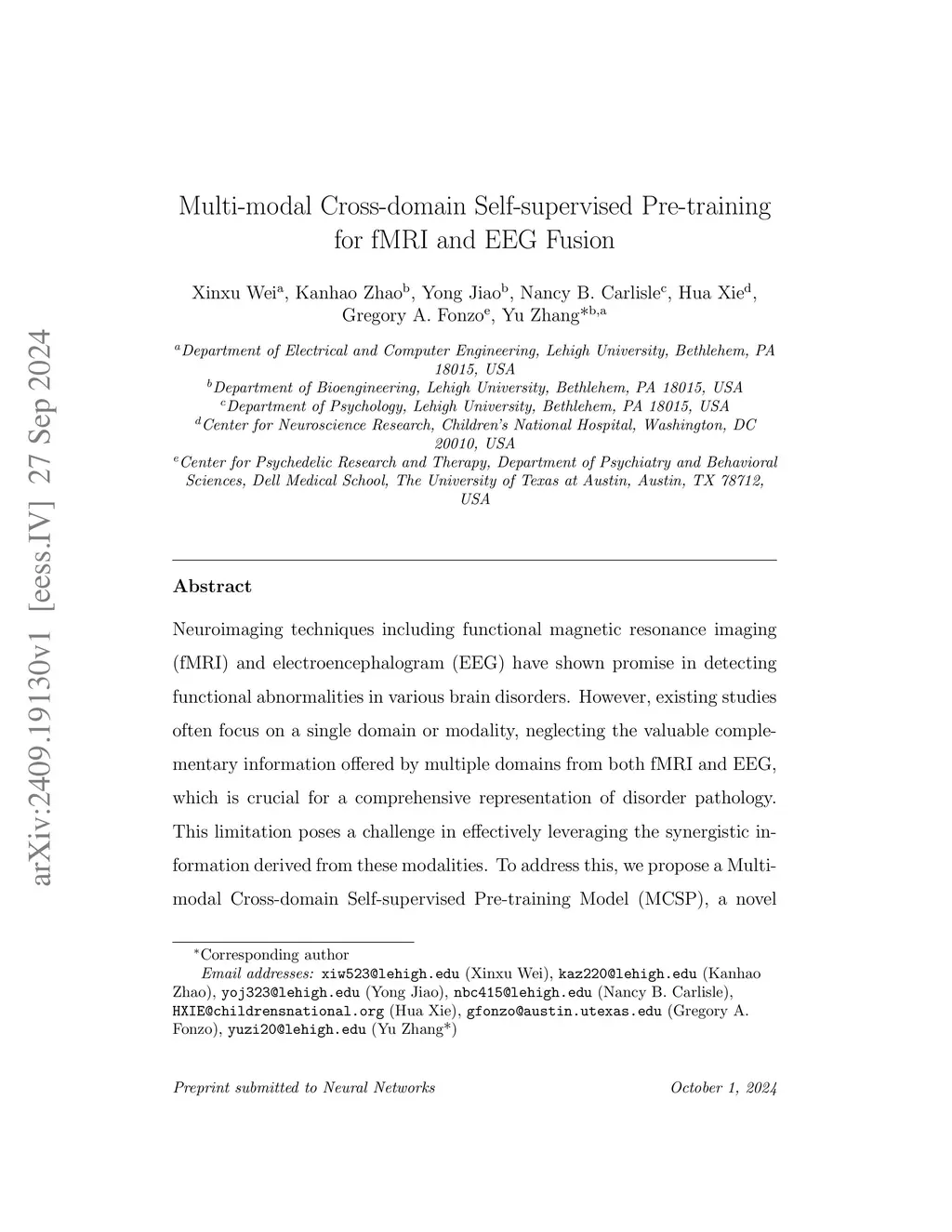 Multi-modal Cross-domain Self-supervised Pre-training for fMRI and EEG