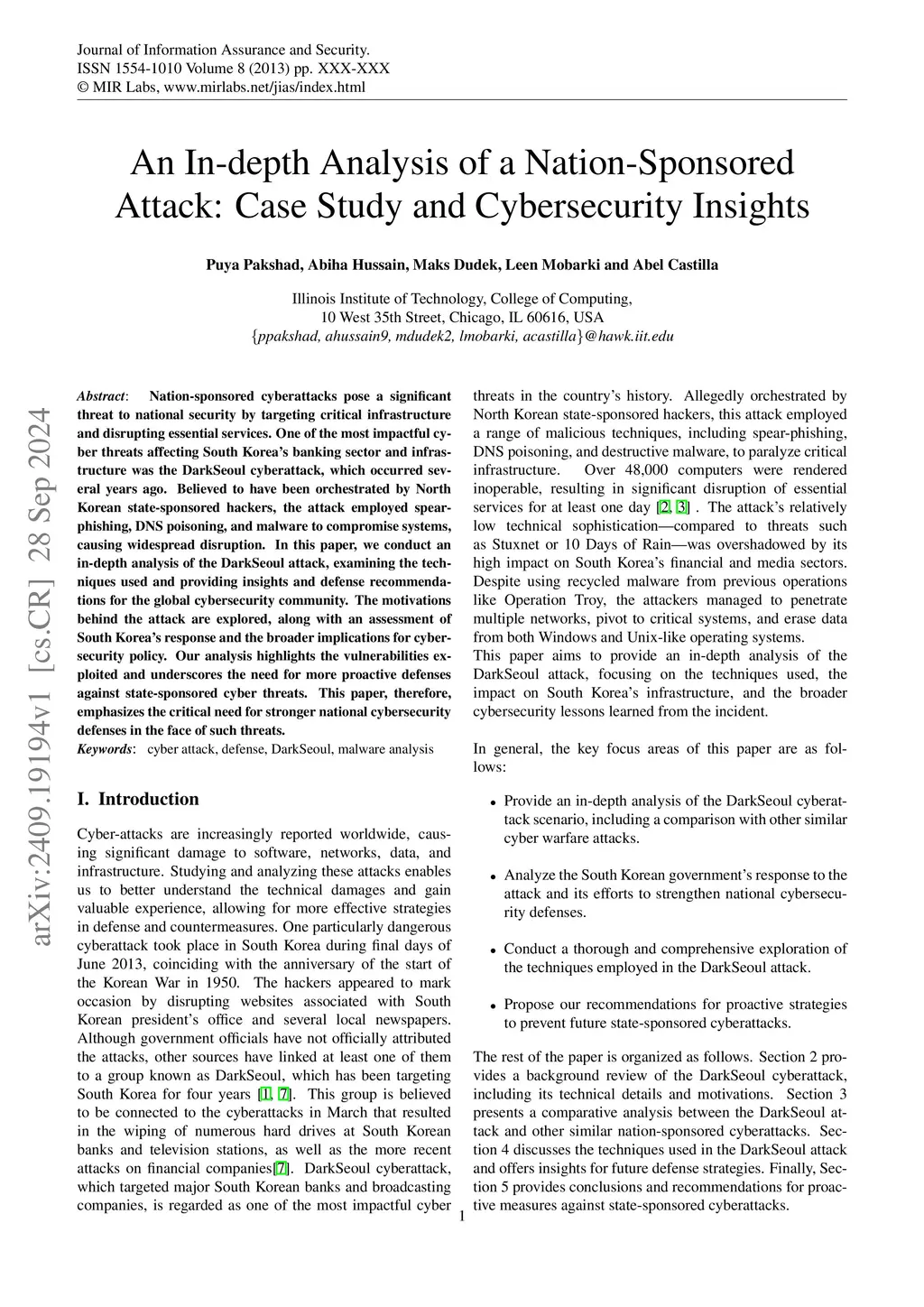 Nation-sponsored cyberattacks pose a significant threat to national security by targeting critical infrastructure and disrupting essential services. One of the most impactful cyber threats affecting South Korea's banking sector and infrastructure was the Dark Seoul cyberattack, which occurred several years ago. Believed to have been orchestrated by North Korean state-sponsored hackers, the attack employed spear phishing, DNS poisoning, and malware to compromise systems, causing widespread disruption. In this paper, we conduct an in-depth analysis of the Dark Seoul attack, examining the techniques used and providing insights and defense recommendations for the global cybersecurity community. The motivations behind the attack are explored, along with an assessment of South Korea's response and the broader implications for cybersecurity policy. Our analysis highlights the vulnerabilities exploited and underscores the need for more proactive defenses against state-sponsored cyber threats. This paper, therefore, emphasizes the critical need for stronger national cybersecurity defenses in the face of such threats.