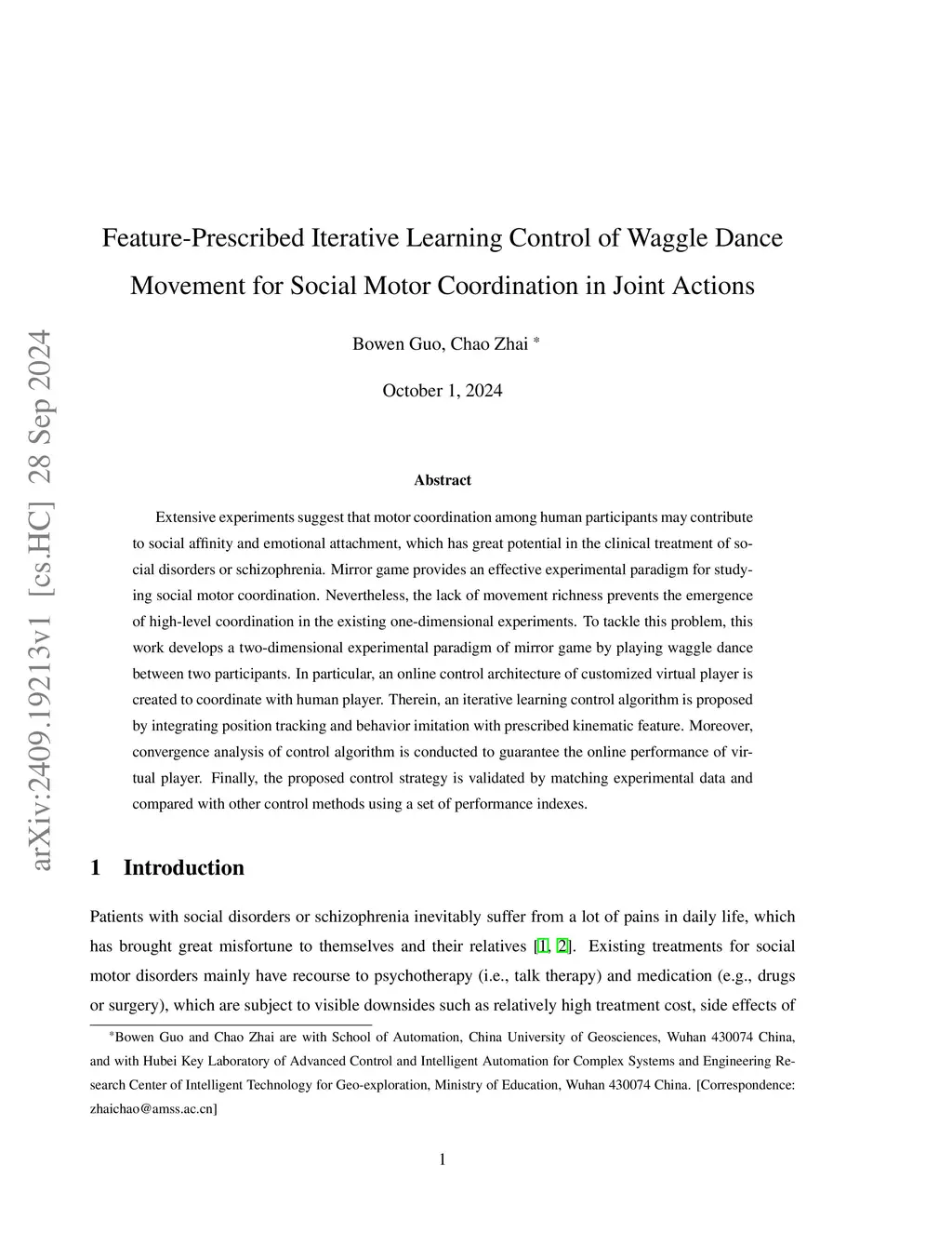 Extensive experiments suggest that motor coordination among human participants may contribute to social affinity and emotional attachment, which has great potential in the clinical treatment of social disorders or schizophrenia. Mirror game provides an effective experimental paradigm for studying social motor coordination. Nevertheless, the lack of movement richness prevents the emergence of high-level coordination in the existing one-dimensional experiments. To tackle this problem, this work develops a two-dimensional experimental paradigm of mirror game by playing waggle dance between two participants. In particular, an online control architecture of customized virtual player is created to coordinate with human player. Therein, an iterative learning control algorithm is proposed by integrating position tracking and behavior imitation with prescribed kinematic feature. Moreover, convergence analysis of control algorithm is conducted to guarantee the online performance of virtual player. Finally, the proposed control strategy is validated by matching experimental data and compared with other control methods using a set of performance indexes.