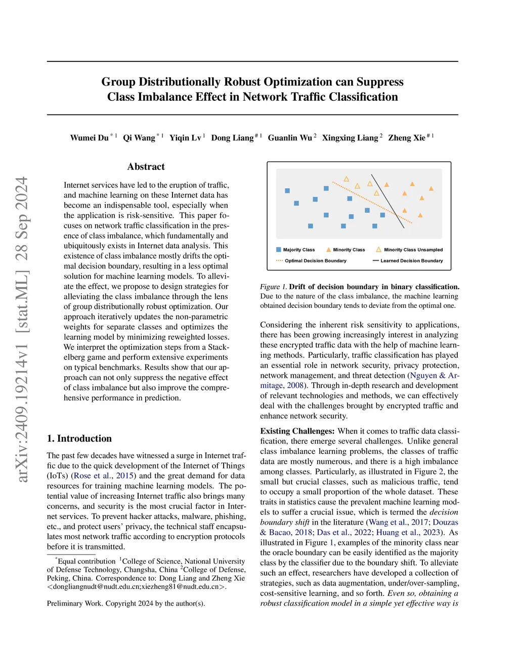 Internet services have led to the eruption of traffic, and machine learning on these Internet data has become an indispensable tool, especially when the application is risk-sensitive. This paper focuses on network traffic classification in the presence of class imbalance, which fundamentally and ubiquitously exists in Internet data analysis. This existence of class imbalance mostly drifts the optimal decision boundary, resulting in a less optimal solution for machine learning models. To alleviate the effect, we propose to design strategies for alleviating the class imbalance through the lens of group distributionally robust optimization. Our approach iteratively updates the non-parametric weights for separate classes and optimizes the learning model by minimizing reweighted losses. We interpret the optimization steps from a Stackelberg game and perform extensive experiments on typical benchmarks. Results show that our approach can not only suppress the negative effect of class imbalance but also improve the comprehensive performance in prediction.