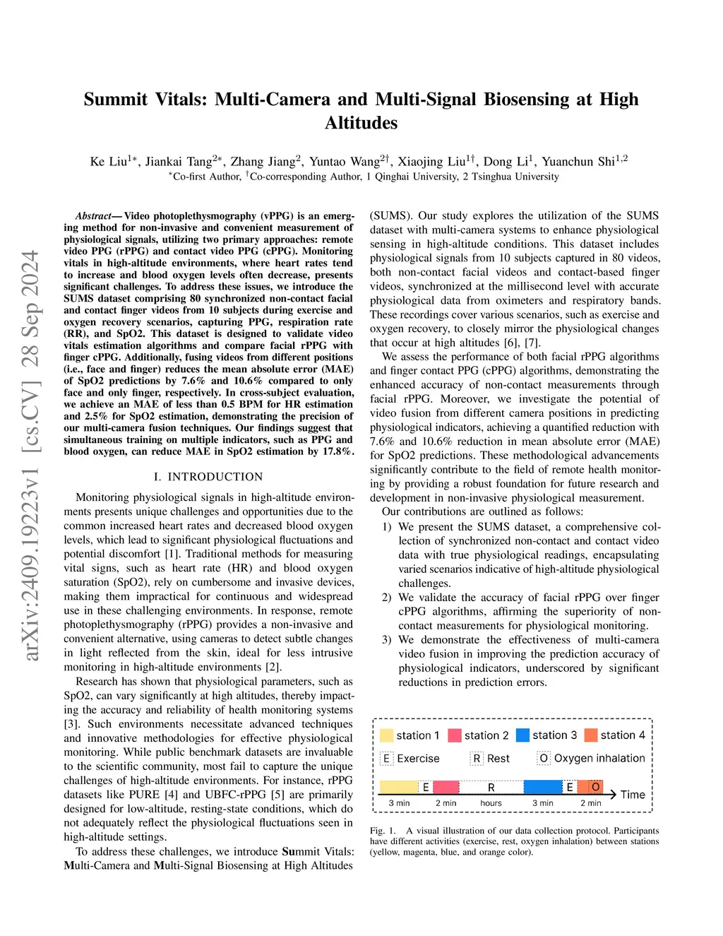 Video photoplethysmography (vPPG) is an emerging method for non-invasive and convenient measurement of physiological signals, utilizing two primary approaches: remote video PPG (rPPG) and contact video PPG (cPPG). Monitoring vitals in high-altitude environments, where heart rates tend to increase and blood oxygen levels often decrease, presents significant challenges. To address these issues, we introduce the SUMS dataset comprising 80 synchronized non-contact facial and contact finger videos from 10 subjects during exercise and oxygen recovery scenarios, capturing PPG, respiration rate (RR), and SpO2. This dataset is designed to validate video vitals estimation algorithms and compare facial rPPG with finger cPPG. Additionally, fusing videos from different positions (i.e., face and finger) reduces the mean absolute error (MAE) of SpO2 predictions by 7.6\% and 10.6\% compared to only face and only finger, respectively. In cross-subject evaluation, we achieve an MAE of less than 0.5 BPM for HR estimation and 2.5\% for SpO2 estimation, demonstrating the precision of our multi-camera fusion techniques. Our findings suggest that simultaneous training on multiple indicators, such as PPG and blood oxygen, can reduce MAE in SpO2 estimation by 17.8\%.