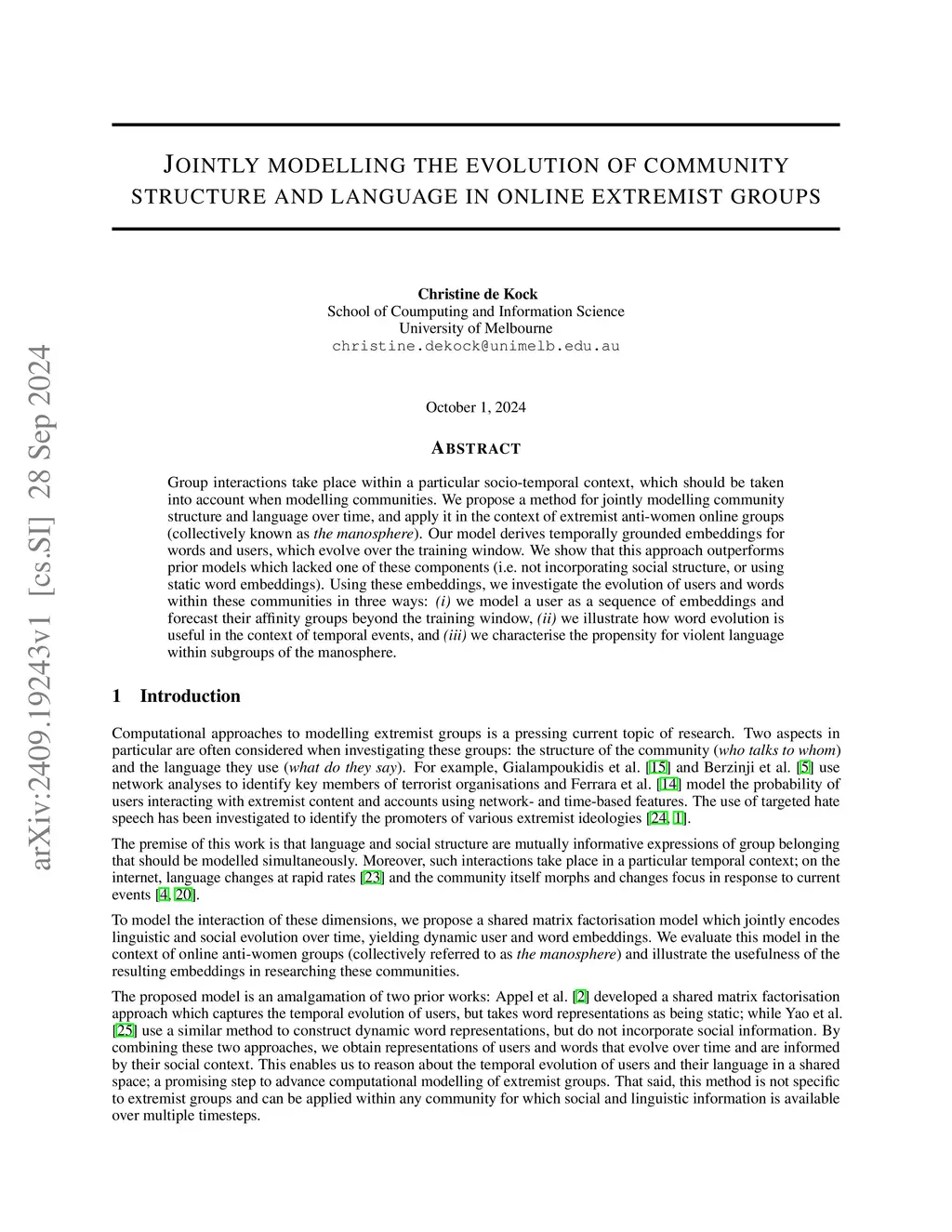 Group interactions take place within a particular socio-temporal context, which should be taken into account when modelling interactions in online communities. We propose a method for jointly modelling community structure and language over time. Our system produces dynamic word and user representations that can be used to cluster users, investigate thematic interests of groups, and predict group membership. We apply and evaluate our method in the context of a set of misogynistic extremist groups. Our results indicate that this approach outperforms prior models which lacked one of these components (i.e. not incorporating social structure, or using static word embeddings) when evaluated on clustering and embedding prediction tasks. Our method further enables novel types of analyses on online groups, including tracing their response to temporal events and quantifying their propensity for using violent language, which is of particular importance in the context of extremist groups.