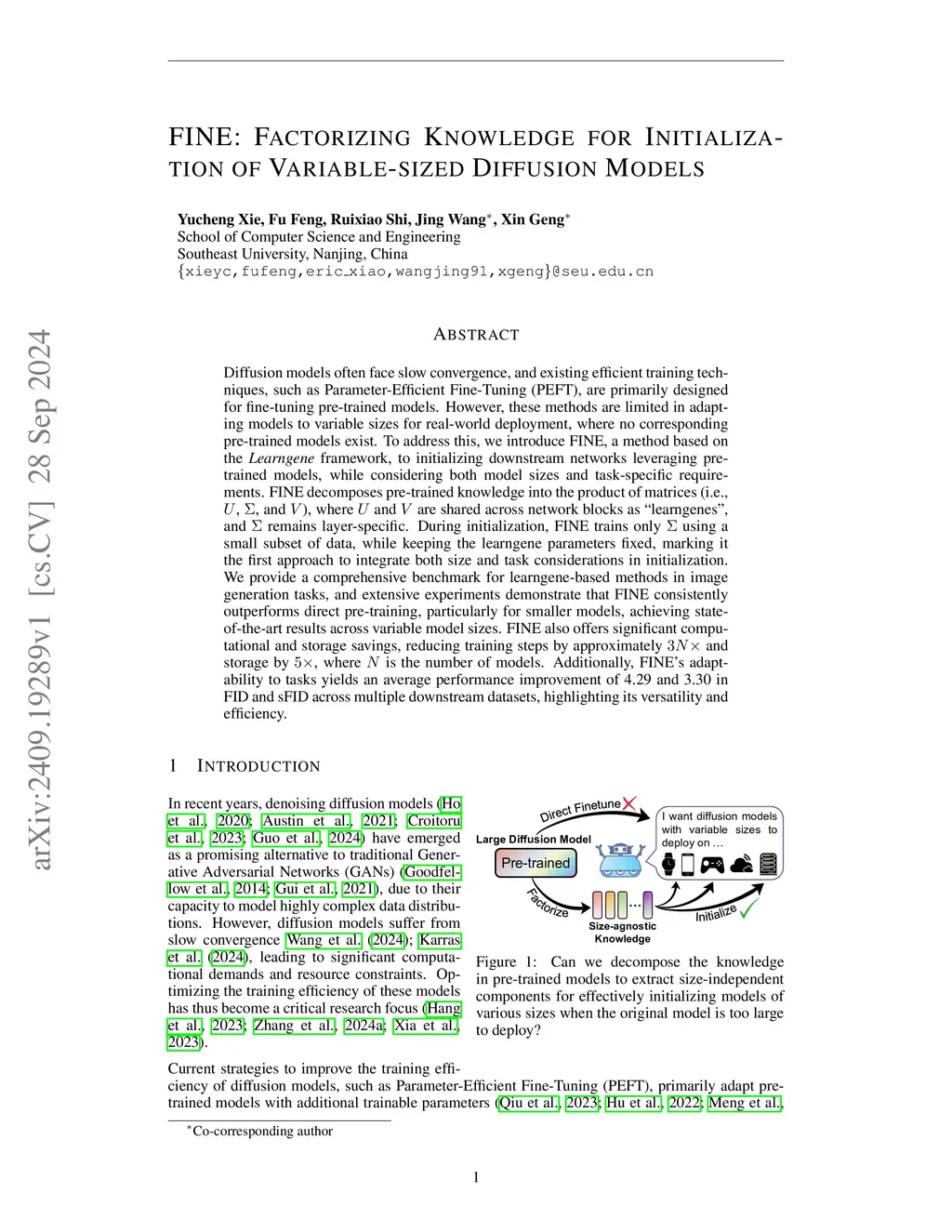 Diffusion models often face slow convergence, and existing efficient training techniques, such as Parameter-Efficient Fine-Tuning (PEFT), are primarily designed for fine-tuning pre-trained models. However, these methods are limited in adapting models to variable sizes for real-world deployment, where no corresponding pre-trained models exist. To address this, we introduce FINE, a method based on the Learngene framework, to initializing downstream networks leveraging pre-trained models, while considering both model sizes and task-specific requirements. FINE decomposes pre-trained knowledge into the product of matrices (i.e., , , and ), where and are shared across network blocks as ``learngenes'', and remains layer-specific. During initialization, FINE trains only using a small subset of data, while keeping the learngene parameters fixed, marking it the first approach to integrate both size and task considerations in initialization. We provide a comprehensive benchmark for learngene-based methods in image generation tasks, and extensive experiments demonstrate that FINE consistently outperforms direct pre-training, particularly for smaller models, achieving state-of-the-art results across variable model sizes. FINE also offers significant computational and storage savings, reducing training steps by approximately and storage by , where is the number of models. Additionally, FINE's adaptability to tasks yields an average performance improvement of 4.29 and 3.30 in FID and sFID across multiple downstream datasets, highlighting its versatility and efficiency.