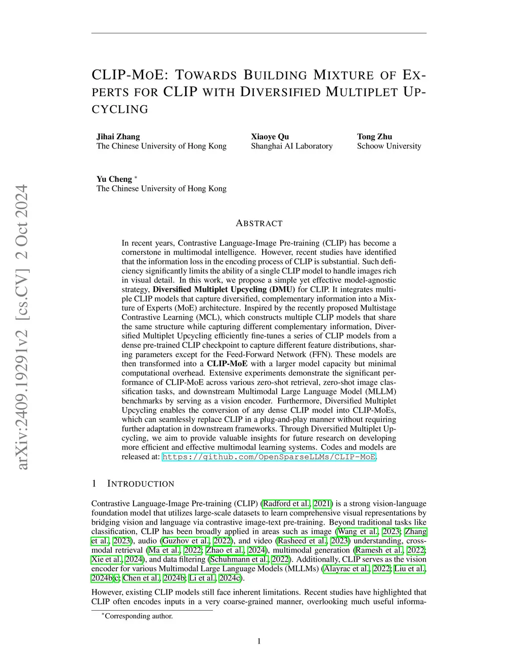 Contrastive Language-Image Pre-training (CLIP) has become a cornerstone in multimodal intelligence. However, recent studies discovered that CLIP can only encode one aspect of the feature space, leading to substantial information loss and indistinctive features. To mitigate this issue, this paper introduces a novel strategy that fine-tunes a series of complementary CLIP models and transforms them into a CLIP-MoE. Specifically, we propose a model-agnostic Diversified Multiplet Upcycling (DMU) framework for CLIP. Instead of training multiple CLIP models from scratch, DMU leverages a pre-trained CLIP and fine-tunes it into a diverse set with highly cost-effective multistage contrastive learning, thus capturing distinct feature subspaces efficiently. To fully exploit these fine-tuned models while minimizing computational overhead, we transform them into a CLIP-MoE, which dynamically activates a subset of CLIP experts, achieving an effective balance between model capacity and computational cost. Comprehensive experiments demonstrate the superior performance of CLIP-MoE across various zero-shot retrieval, zero-shot image classification tasks, and downstream Multimodal Large Language Model (MLLM) benchmarks when used as a vision encoder.