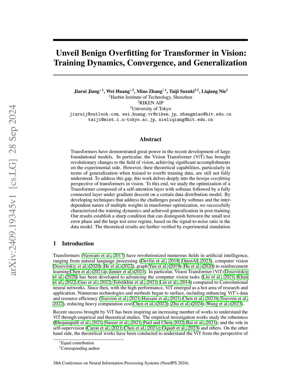 Unveil Benign Overfitting for Transformer in Vision: Training Dynamics,