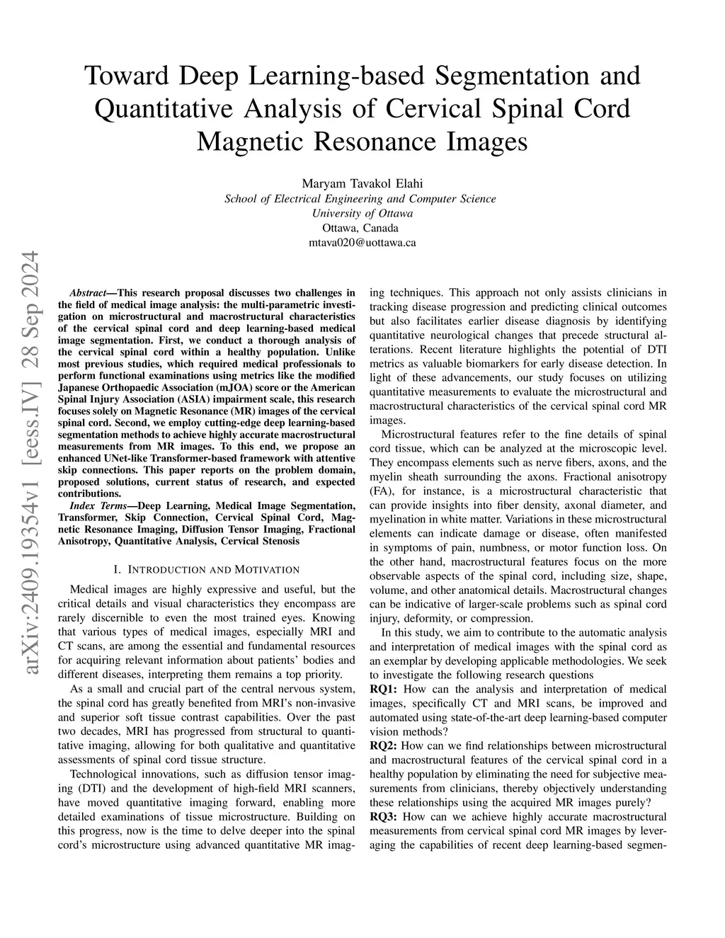 This research proposal discusses two challenges in the field of medical image analysis: the multi-parametric investigation on microstructural and macrostructural characteristics of the cervical spinal cord and deep learning-based medical image segmentation. First, we conduct a thorough analysis of the cervical spinal cord within a healthy population. Unlike most previous studies, which required medical professionals to perform functional examinations using metrics like the modified Japanese Orthopaedic Association (mJOA) score or the American Spinal Injury Association (ASIA) impairment scale, this research focuses solely on Magnetic Resonance (MR) images of the cervical spinal cord. Second, we employ cutting-edge deep learning-based segmentation methods to achieve highly accurate macrostructural measurements from MR images. To this end, we propose an enhanced UNet-like Transformer-based framework with attentive skip connections. This paper reports on the problem domain, proposed solutions, current status of research, and expected contributions.