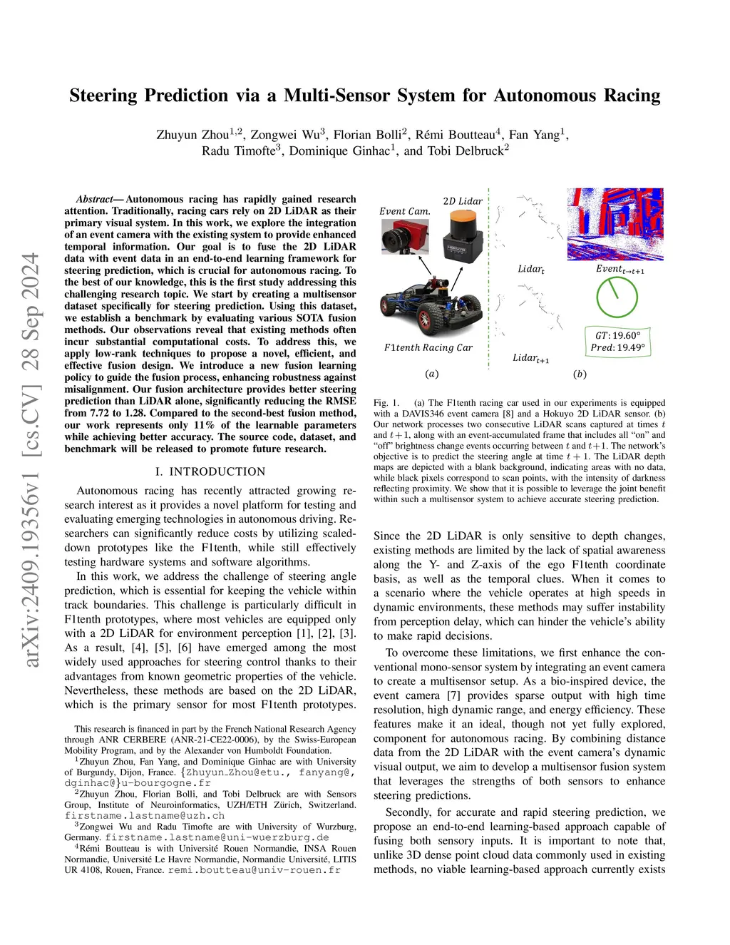 Autonomous racing has rapidly gained research attention. Traditionally, racing cars rely on 2D LiDAR as their primary visual system. In this work, we explore the integration of an event camera with the existing system to provide enhanced temporal information. Our goal is to fuse the 2D LiDAR data with event data in an end-to-end learning framework for steering prediction, which is crucial for autonomous racing. To the best of our knowledge, this is the first study addressing this challenging research topic. We start by creating a multisensor dataset specifically for steering prediction. Using this dataset, we establish a benchmark by evaluating various SOTA fusion methods. Our observations reveal that existing methods often incur substantial computational costs. To address this, we apply low-rank techniques to propose a novel, efficient, and effective fusion design. We introduce a new fusion learning policy to guide the fusion process, enhancing robustness against misalignment. Our fusion architecture provides better steering prediction than LiDAR alone, significantly reducing the RMSE from 7.72 to 1.28. Compared to the second-best fusion method, our work represents only 11% of the learnable parameters while achieving better accuracy. The source code, dataset, and benchmark will be released to promote future research.