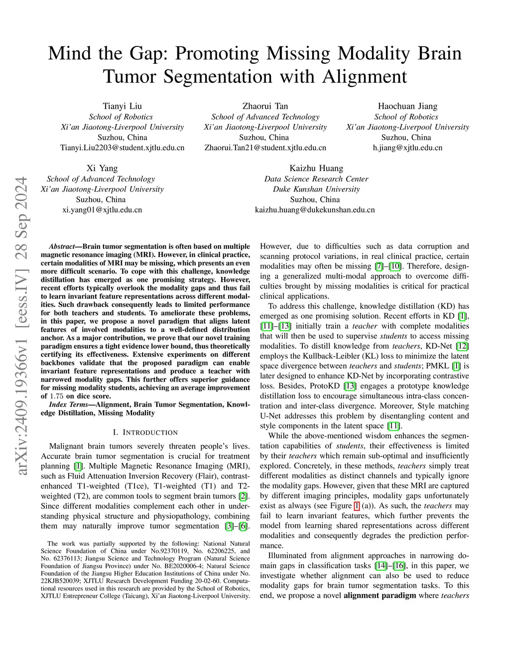 Brain tumor segmentation is often based on multiple magnetic resonance imaging (MRI). However, in clinical practice, certain modalities of MRI may be missing, which presents an even more difficult scenario. To cope with this challenge, knowledge distillation has emerged as one promising strategy. However, recent efforts typically overlook the modality gaps and thus fail to learn invariant feature representations across different modalities. Such drawback consequently leads to limited performance for both teachers and students. To ameliorate these problems, in this paper, we propose a novel paradigm that aligns latent features of involved modalities to a well-defined distribution anchor. As a major contribution, we prove that our novel training paradigm ensures a tight evidence lower bound, thus theoretically certifying its effectiveness. Extensive experiments on different backbones validate that the proposed paradigm can enable invariant feature representations and produce a teacher with narrowed modality gaps. This further offers superior guidance for missing modality students, achieving an average improvement of 1.75 on dice score.