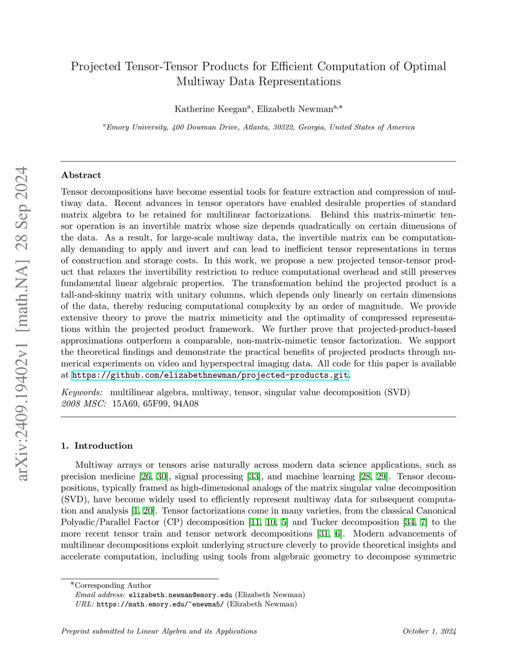Tensor decompositions have become essential tools for feature extraction and compression of multiway data. Recent advances in tensor operators have enabled desirable properties of standard matrix algebra to be retained for multilinear factorizations. Behind this matrix-mimetic tensor operation is an invertible matrix whose size depends quadratically on certain dimensions of the data. As a result, for large-scale multiway data, the invertible matrix can be computationally demanding to apply and invert and can lead to inefficient tensor representations in terms of construction and storage costs. In this work, we propose a new projected tensor-tensor product that relaxes the invertibility restriction to reduce computational overhead and still preserves fundamental linear algebraic properties. The transformation behind the projected product is a tall-and-skinny matrix with unitary columns, which depends only linearly on certain dimensions of the data, thereby reducing computational complexity by an order of magnitude. We provide extensive theory to prove the matrix mimeticity and the optimality of compressed representations within the projected product framework. We further prove that projected-product-based approximations outperform a comparable, non-matrix-mimetic tensor factorization. We support the theoretical findings and demonstrate the practical benefits of projected products through numerical experiments on video and hyperspectral imaging data.