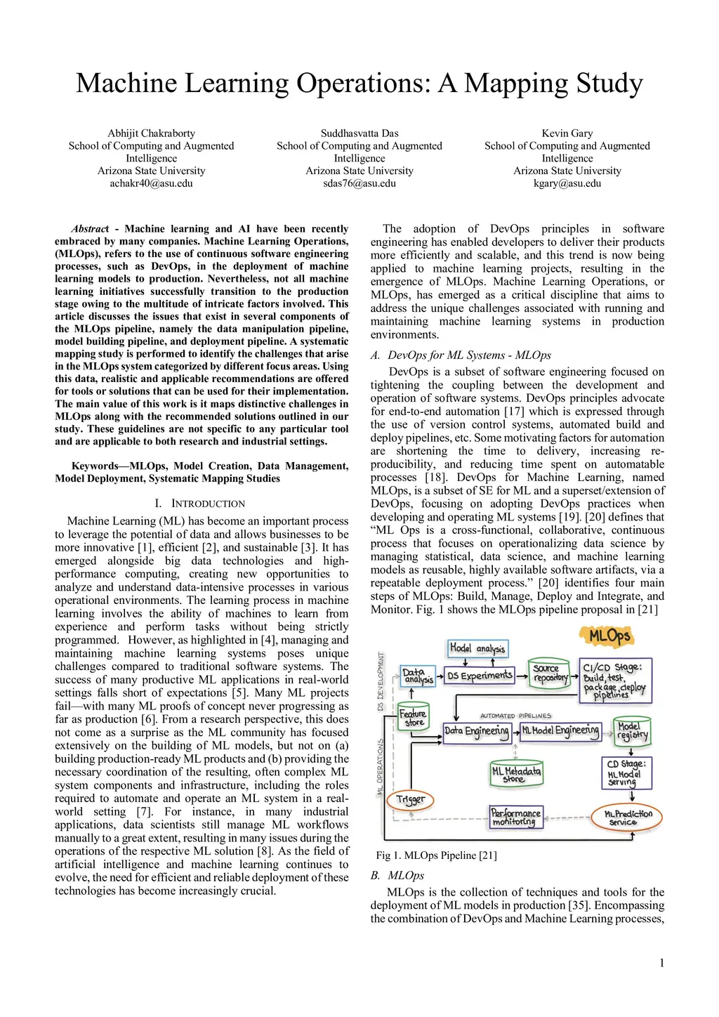 Machine learning and AI have been recently embraced by many companies. Machine Learning Operations, (MLOps), refers to the use of continuous software engineering processes, such as DevOps, in the deployment of machine learning models to production. Nevertheless, not all machine learning initiatives successfully transition to the production stage owing to the multitude of intricate factors involved. This article discusses the issues that exist in several components of the MLOps pipeline, namely the data manipulation pipeline, model building pipeline, and deployment pipeline. A systematic mapping study is performed to identify the challenges that arise in the MLOps system categorized by different focus areas. Using this data, realistic and applicable recommendations are offered for tools or solutions that can be used for their implementation. The main value of this work is it maps distinctive challenges in MLOps along with the recommended solutions outlined in our study. These guidelines are not specific to any particular tool and are applicable to both research and industrial settings.