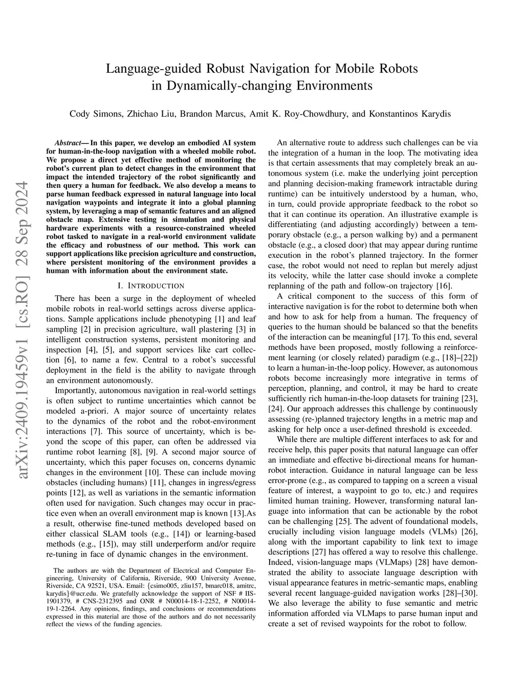 In this paper, we develop an embodied AI system for human-in-the-loop navigation with a wheeled mobile robot. We propose a direct yet effective method of monitoring the robot's current plan to detect changes in the environment that impact the intended trajectory of the robot significantly and then query a human for feedback. We also develop a means to parse human feedback expressed in natural language into local navigation waypoints and integrate it into a global planning system, by leveraging a map of semantic features and an aligned obstacle map. Extensive testing in simulation and physical hardware experiments with a resource-constrained wheeled robot tasked to navigate in a real-world environment validate the efficacy and robustness of our method. This work can support applications like precision agriculture and construction, where persistent monitoring of the environment provides a human with information about the environment state.