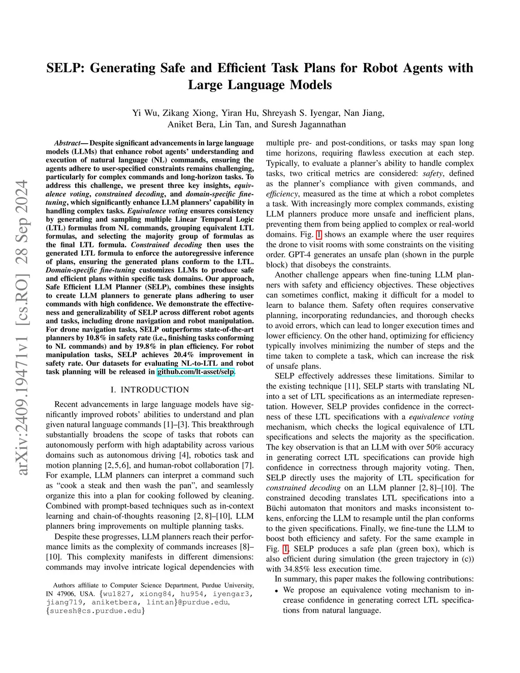 SELP: Generating Safe and Efficient Task Plans for Robot Agents with Large Language Models