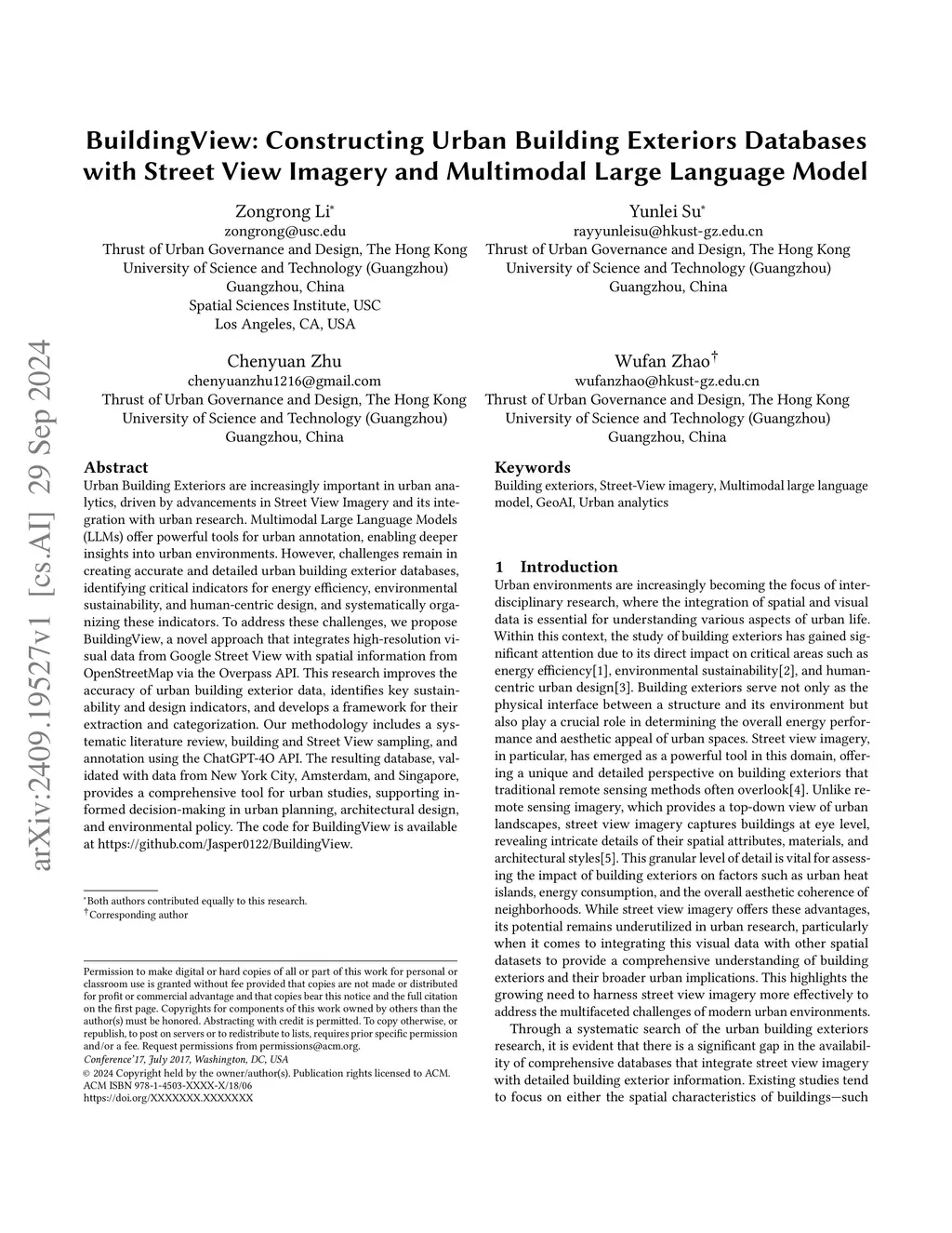 Urban Building Exteriors are increasingly important in urban analytics, driven by advancements in Street View Imagery and its integration with urban research. Multimodal Large Language Models (LLMs) offer powerful tools for urban annotation, enabling deeper insights into urban environments. However, challenges remain in creating accurate and detailed urban building exterior databases, identifying critical indicators for energy efficiency, environmental sustainability, and human-centric design, and systematically organizing these indicators. To address these challenges, we propose BuildingView, a novel approach that integrates high-resolution visual data from Google Street View with spatial information from OpenStreetMap via the Overpass API. This research improves the accuracy of urban building exterior data, identifies key sustainability and design indicators, and develops a framework for their extraction and categorization. Our methodology includes a systematic literature review, building and Street View sampling, and annotation using the ChatGPT-4O API. The resulting database, validated with data from New York City, Amsterdam, and Singapore, provides a comprehensive tool for urban studies, supporting informed decision-making in urban planning, architectural design, and environmental policy. The code for BuildingView is available atthis https URL.