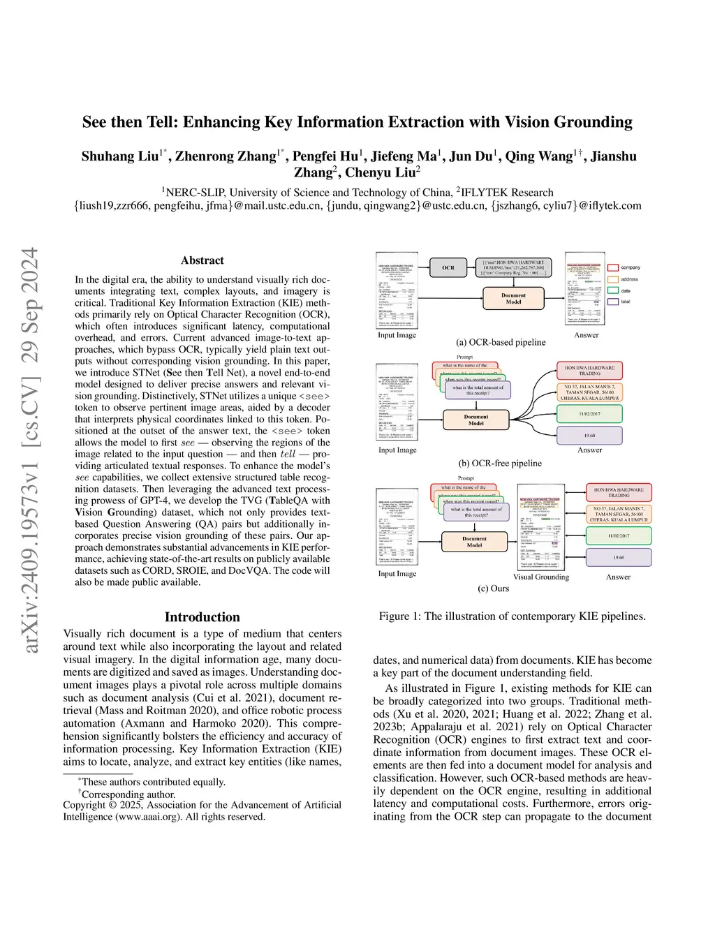 In the digital era, the ability to understand visually rich documents that integrate text, complex layouts, and imagery is critical. Traditional Key Information Extraction (KIE) methods primarily rely on Optical Character Recognition (OCR), which often introduces significant latency, computational overhead, and errors. Current advanced image-to-text approaches, which bypass OCR, typically yield plain text outputs without corresponding vision grounding. In this paper, we introduce STNet (See then Tell Net), a novel end-to-end model designed to deliver precise answers with relevant vision grounding. Distinctively, STNet utilizes a unique <see> token to observe pertinent image areas, aided by a decoder that interprets physical coordinates linked to this token. Positioned at the outset of the answer text, the <see> token allows the model to first see-observing the regions of the image related to the input question-and then tell-providing articulated textual responses. To enhance the model's seeing capabilities, we collect extensive structured table recognition datasets. Leveraging the advanced text processing prowess of GPT-4, we develop the TVG (TableQA with Vision Grounding) dataset, which not only provides text-based Question Answering (QA) pairs but also incorporates precise vision grounding for these pairs. Our approach demonstrates substantial advancements in KIE performance, achieving state-of-the-art results on publicly available datasets such as CORD, SROIE, and DocVQA. The code will also be made publicly available.