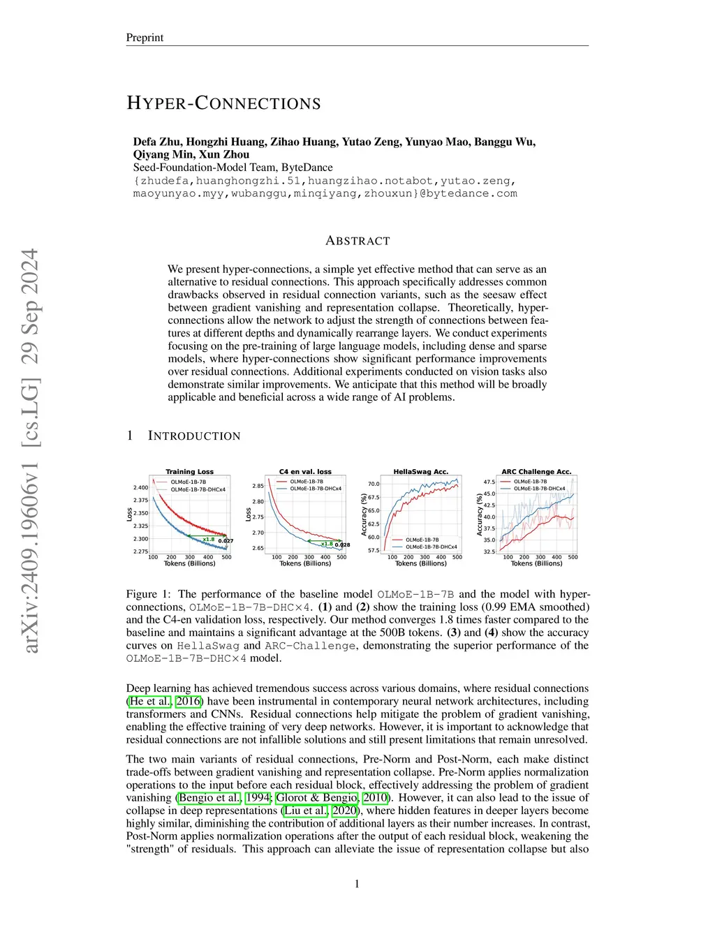 We present hyper-connections, a simple yet effective method that can serve as an alternative to residual connections. This approach specifically addresses common drawbacks observed in residual connection variants, such as the seesaw effect between gradient vanishing and representation collapse. Theoretically, hyper-connections allow the network to adjust the strength of connections between features at different depths and dynamically rearrange layers. We conduct experiments focusing on the pre-training of large language models, including dense and sparse models, where hyper-connections show significant performance improvements over residual connections. Additional experiments conducted on vision tasks also demonstrate similar improvements. We anticipate that this method will be broadly applicable and beneficial across a wide range of AI problems.