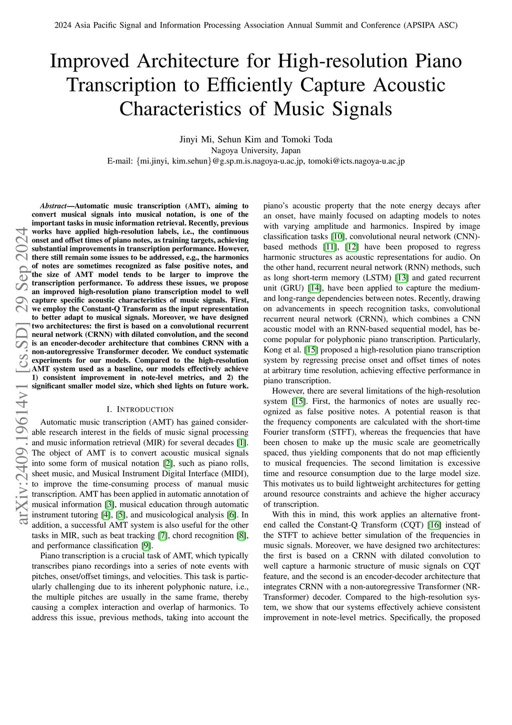 Improved Architecture for High-resolution Piano Transcription to