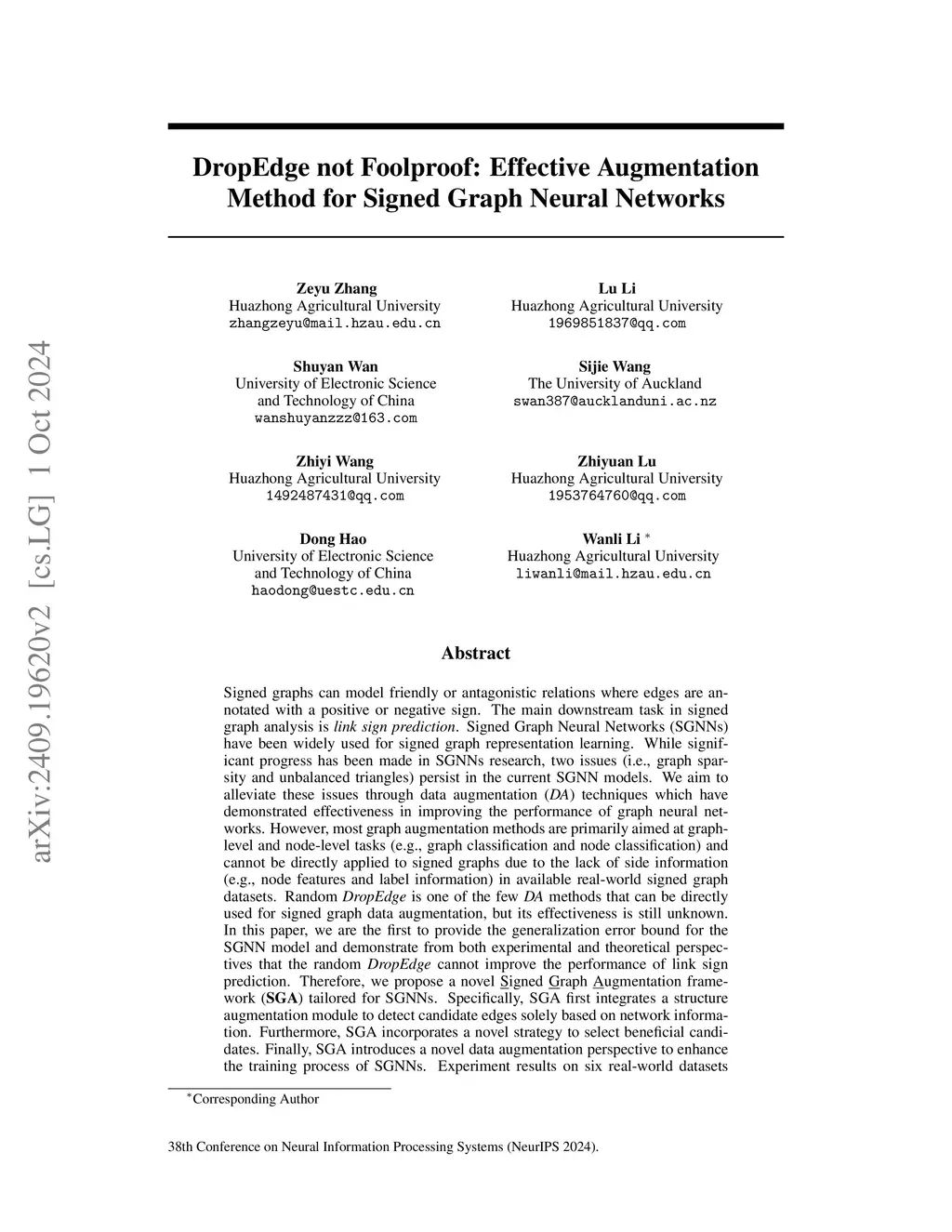 The paper discusses signed graphs, which model friendly or antagonistic relationships using edges marked with positive or negative signs, focusing on the task of link sign prediction. While Signed Graph Neural Networks (SGNNs) have advanced, they face challenges like graph sparsity and unbalanced triangles. The authors propose using data augmentation (DA) techniques to address these issues, although many existing methods are not suitable for signed graphs due to a lack of side information. They highlight that the random DropEdge method, a rare DA approach applicable to signed graphs, does not enhance link sign prediction performance. In response, they introduce the Signed Graph Augmentation (SGA) framework, which includes a structure augmentation module to identify candidate edges and a strategy for selecting beneficial candidates, ultimately improving SGNN training. Experimental results show that SGA significantly boosts the performance of SGNN models, with a notable 32.3% improvement in F1-micro for SGCN on the Slashdot dataset.